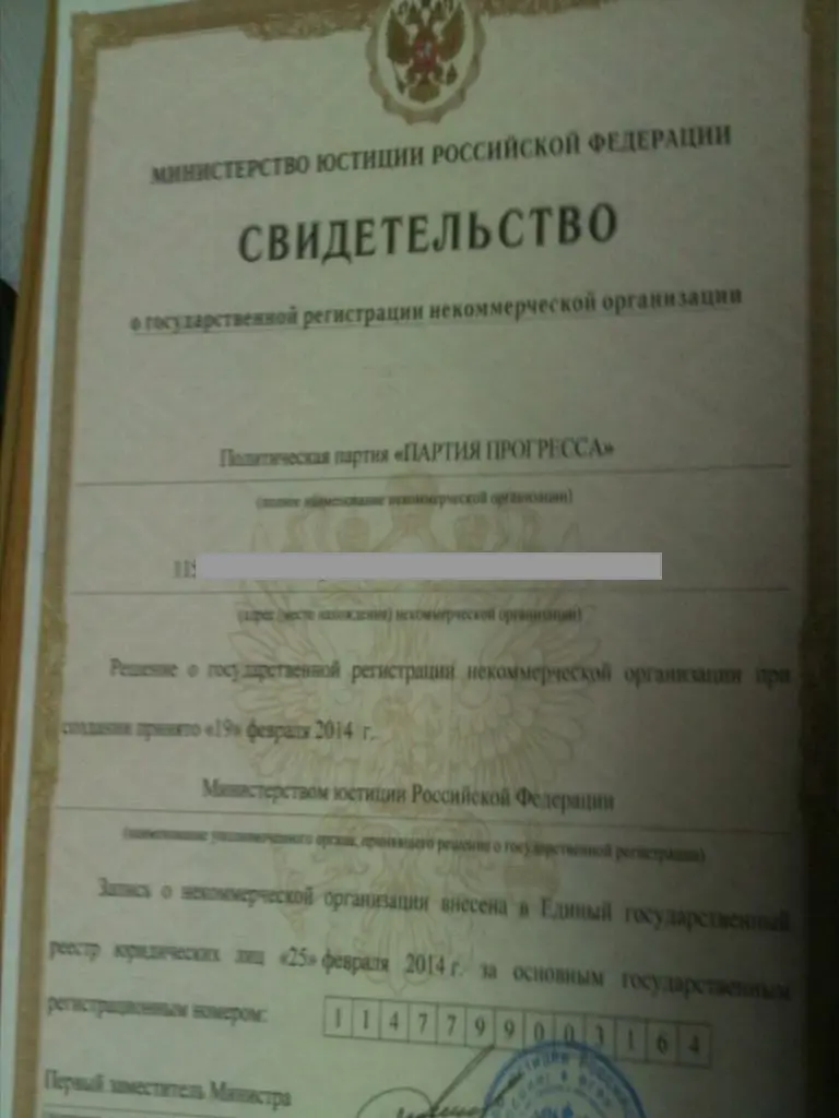 Министерство юстиции зарегистрировало Партию прогресса, которую возглавляет оппозиционер Алексей Навальный. Фотография свидетельства о регистрации опубликована в твиттере телеканала «Дождь».