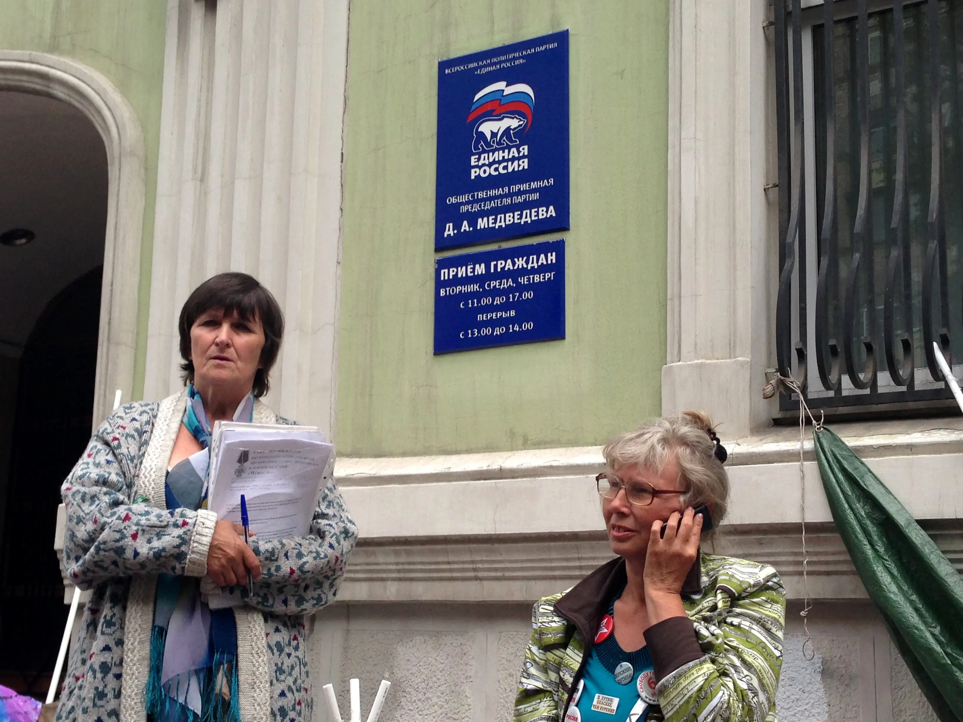 На фото: Ирина Калмыкова и Екатерина Мальдон у приемной «Единой России»