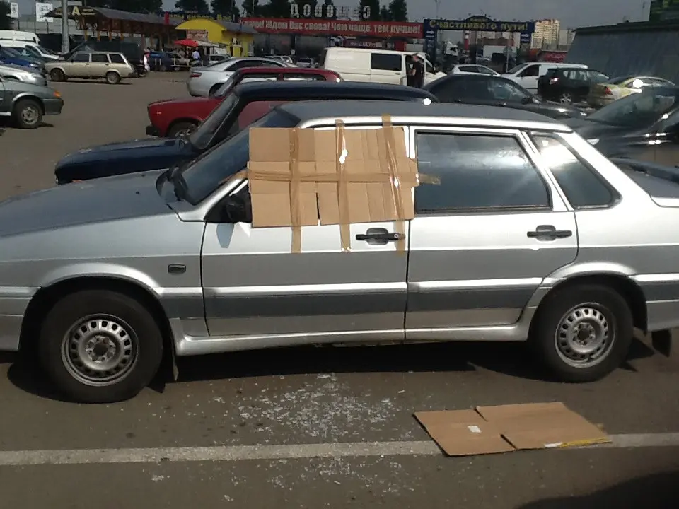 Идем на стоянку. Шариф подводит к автомобилю, у которого вместо водительского стекла наспех закрепленная скотчем картонка. Асфальт рядом с дверью усыпан осколками.