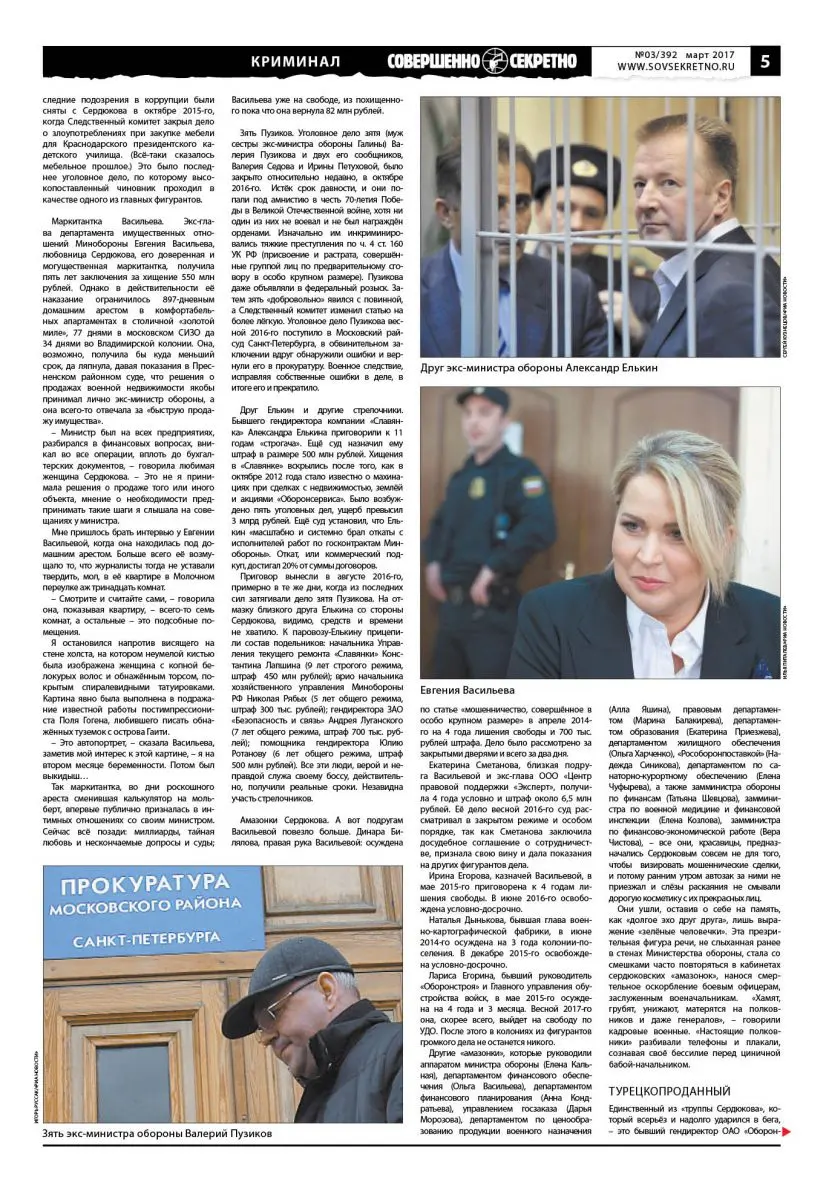 Зять Пузиков. Уголовное дело зятя (муж сестры экс-министра обороны Галины) Валерия Пузикова и двух его сообщников, Валерия Седова и Ирины Петуховой, было закрыто относительно недавно, в октябре 2016-го. Истёк срок давности, и они попали под амнистию в честь 70-летия Победы в Великой Отечественной войне, хотя ни один из них не воевал и не был награждён орденами. Изначально им инкриминировались тяжкие преступления по ч. 4 ст. 160 УК РФ (присвоение и растрата, совершённые группой лиц по предварительному сговору в особо крупном размере). Пузикова даже объявляли в федеральный розыск. Затем зять «добровольно» явился с повинной, а Следственный комитет изменил статью на более лёгкую. Уголовное дело Пузикова весной 2016-го поступило в Московский райсуд Санкт-Петербурга, в обвинительном заключении вдруг обнаружили ошибки и вернули его в прокуратуру. Военное следствие, исправляя собственные ошибки в деле, в итоге его и прекратило