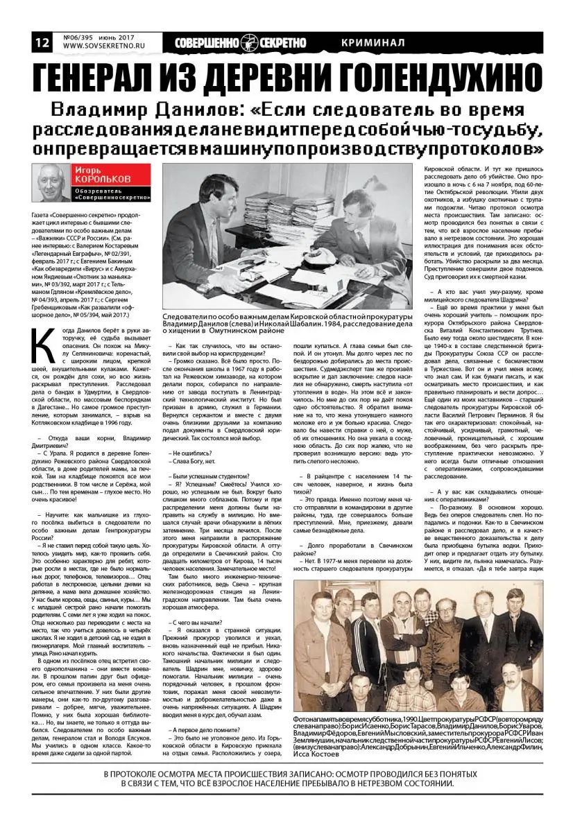 Газета «Совершенно секретно» продолжает цикл интервью с бывшими следователями по особо важным делам – «Важняки» СССР и России». (См. ранее интервью: с Валерием Костаревым «Легендарный Евграфыч», № 02/391, февраль 2017 г.; с Евгением Бакиным «Как обезвредили «Вирус» и с Амурханом Яндиевым «Охотник за маньяками», № 03/392, март 2017 г.; с Тельманом Гдляном «Кремлёвское дело», № 04/393, апрель 2017 г.; с Сергеем Гребенщиковым «Как развалили «офшорное дело», № 05/394, май 2017.)
