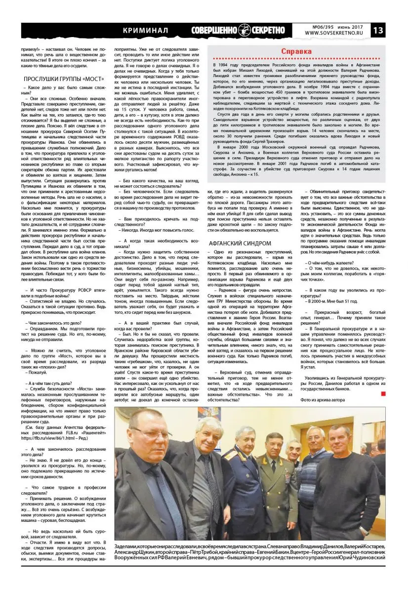 – Радчиков – фигура очень непростая. Служил в войсках специального назначения ГРУ Министерства обороны. Во время одной из операций на территории Афганистана потерял обе ноги. Добивался представления к званию Героя России. Возглавив вначале Российский фонд инвалидов войны в Афганистане, а затем Российский общественный фонд инвалидов военной службы, обладал большими связями и значительным влиянием, «много знал», что, на мой взгляд, и сказалось на первом решении военного суда. Как только Радчиков погиб, ситуация изменилась.