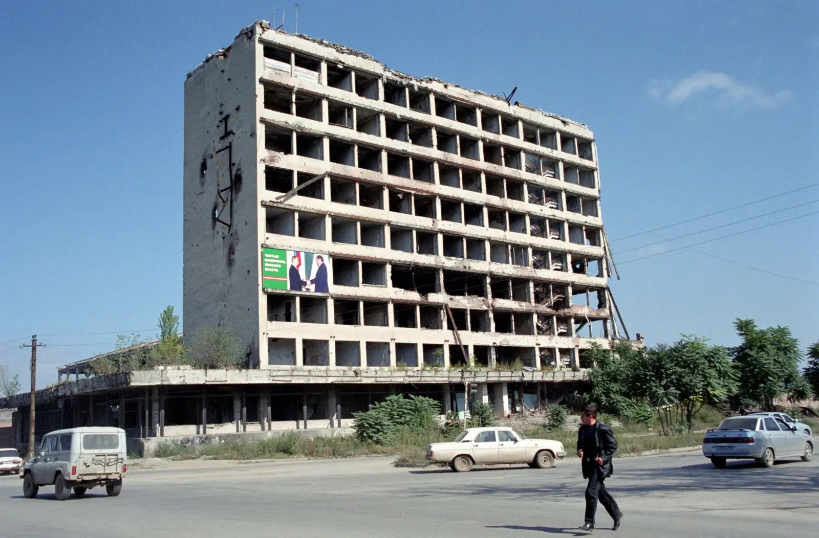Досталось Дому печати и во время январского штурма Грозного 1995 года, и во время боев августа 1996 года, и когда Грозный штурмовали вновь уже зимой 1999–2000 года. Так что, когда я его фотографировал лет 10 назад, он больше походил на скелет покойника. Рядом – площадь Дружбы народов, где некогда возвышался памятник трем революционерам, призванный символизировать дружбу русского, чеченского и ингушского народов. Правда, на моей памяти его чаще именовали «Три дурака», а во время первой войны у всех трех каменных фигур оторвали головы, которые валялись поблизости. Потом на пьедестале и вовсе остались лишь обрубки шести каменных ног. Утверждают, что между 1996 и 1999 годом там функционировал самый настоящий рынок рабов. Еще то место запомнилось мне частыми телерепортажами из межвоенной Чечни о расстрелах по приговорам шариатских судов: их там публично приводили в исполнение, транслируя по местному телевидению.