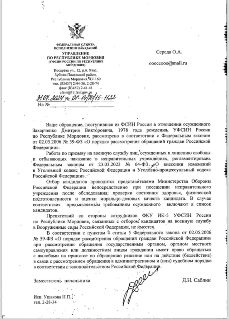 Письмо президенту с просьбой об отправке на СВО и ответ ФСИН