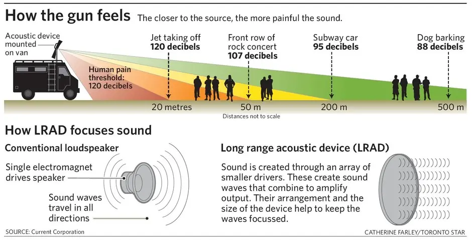 Однако подвижки в этой области у американцев есть, правда, по сути, созданы только отдаленные прототипы психотропного оружия, о котором мечтают военные. Первым результатом этой работы, который можно пощупать, стала установка LRAD (Long Range Acoustic Device, акустическое устройство дальнего действия), первый опытный образец которой был построен в 2000 году. Первоначально эти установки разрабатывались для предотвращения несанкционированного доступа посторонних лиц на объекты особой государственной важности, такие как военные базы, резиденции, ядерные станции. После появилась идея снабдить ими все крупные суда, чтобы вооружить корабли для защиты от нападения террористов. LRAD поражает противника мощным рокотом до 150 децибел. Для сравнения: шум двигателей реактивного самолета составляет около 120 децибел, а звук выше 130 децибел вполне способен повредить слуховой аппарат человека. В ноябре 2005 года круизный лайнер Seabourn Spirit с помощью этой установки отразил атаку морских пиратов в районе Сомали.