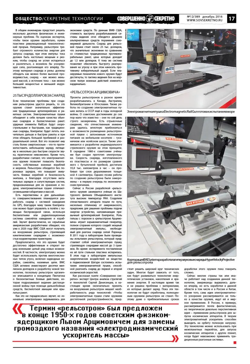 Сейчас многие страны так или иначе работают над созданием данной технологии, американцы вырвались далеко вперёд, но есть наработки в данной области в том числе и в России и Китае. Кроме того, сама идея электромагнитного ускорения рассматривается не только в качестве оружия, ищут ей и мирное применение. В России, к примеру, рассматривается почти фантастическая, но теоретически довольно перспективная идея – применение рельсотронов для запуска космических аппаратов. В теории электромагнитный ускоритель способен выводить на орбиту полезную нагрузку. Эту технологию можно использовать при межпланетных перелётах, для запуска космических аппаратов с других планет, когда будет невозможно применять традиционные разгонные системы».