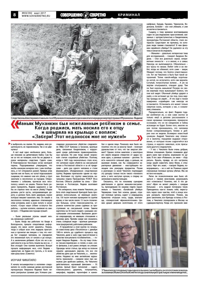 – Я проработал в этой группе по печально известному делу «Лесополоса» с декабря 1985-го вплоть до судебного процесса над Чикатило, даже в зале суда присутствовал в качестве консультанта гособвинителя… – говорит Амурхан Яндиев. – На эту тему столько писано-переписано и статей, и книг, снято фильмов, а всё равно интерес не утихает. Однажды читал статью, где автор на полном серьёзе «доказывал» версию, что все эти убийства дело рук не Чикатило, а… инопланетян. Недавно ко мне английские журналисты приезжали – снимали кино про маньяков для арабских шейхов… Но Чикатило действительно «кровавый феномен» – 55 трупов. Целый букет патологий – садист, гомосексуалист, душитель, потрошитель, некрофил, педофил, геронтофил и каннибал в одном лице. Поначалу мне было непонятно: что это за монстр такой – получает удовольствие от того, что так зверски убивает? Однако потом заметили: у некоторых его жертв входное отверстие от удара ножом одно, а раневых каналов – десятки. То есть наносится сильный удар, а дальше, не вынимая лезвия, как бы совершаются характерные движения – «мастурбация» колющим или режущим предметом. Позже в разговоре со мной Чикатило подтвердил эту догадку: только после такого «полового акта» у него наступал оргазм, а сперму он запихивал в жертву пальцем.