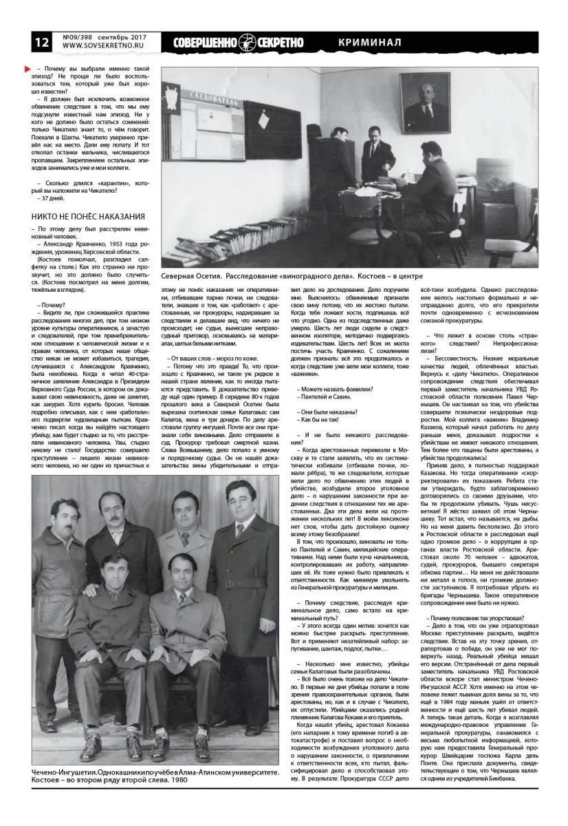 – Потому что это правда! То, что произошло с Кравченко, не такое уж редкое в нашей стране явление, как то иногда пытаются представить. В доказательство приведу ещё один пример. В середине 80-х годов прошлого века в Северной Осетии была вырезана осетинская семья Калаговых: сам Калагов, жена и три дочери. По делу арестовали группу ингушей. Почти все они признали себя виновными. Дело отправили в суд. Прокурор требовал смертной казни. Слава Всевышнему, дело попало к умному и порядочному судье. Он не нашёл доказательства вины убедительными и отправил дело на доследование. Дело поручили мне. Выяснилось: обвиняемые признали свою вину потому, что их жестоко пытали. Когда тебе ломают кости, подпишешь всё что угодно. Одна из подследственных даже умерла. Шесть лет люди сидели в следственном изоляторе, методично подвергаясь издевательствам. Шесть лет! Всех их могла постичь участь Кравченко. С сожалением должен признать: всё это продолжалось и когда следствие уже вели мои коллеги, тоже «важняки».
