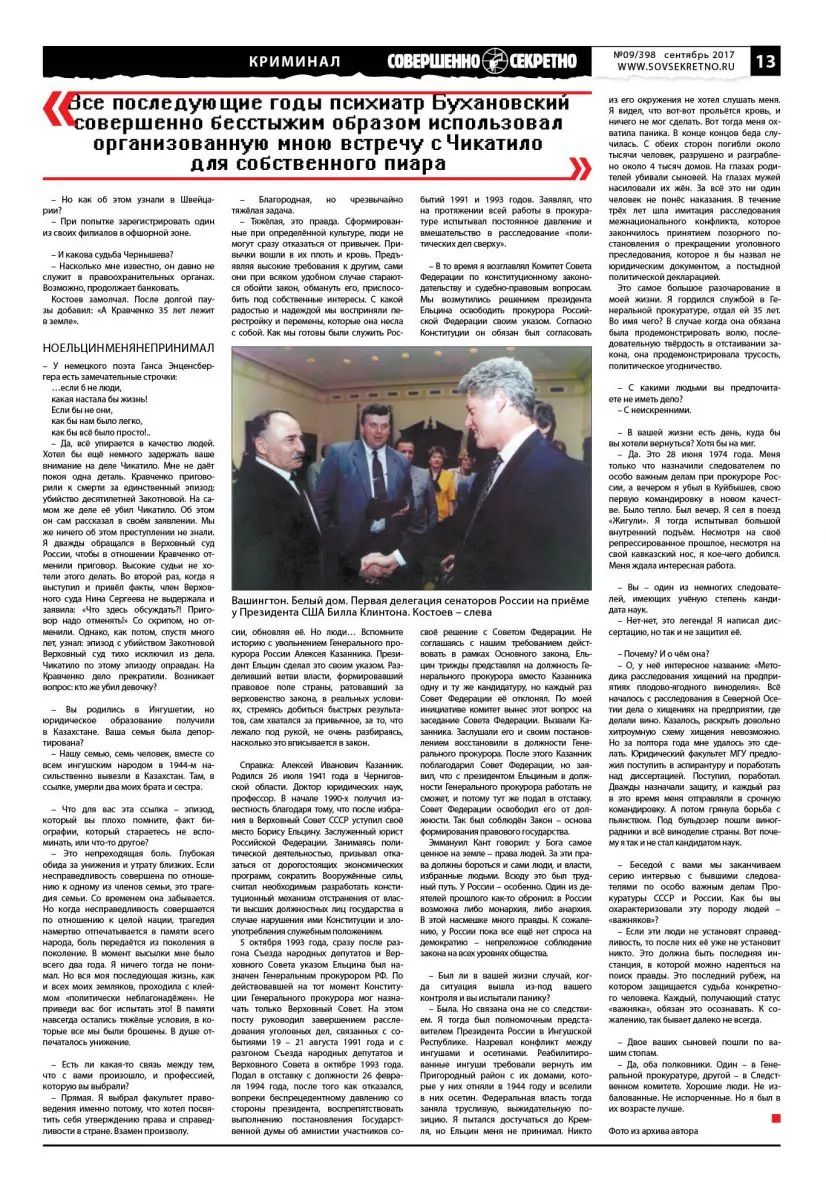 Газета «Совершенно секретно» завершает цикл интервью с бывшими следователями по особо важным делам – «Важняки» СССР и России». (См. ранее интервью: с Валерием Костаревым, №2/391, февраль 2017; с Евгением Бакиным «Как обезвредили «Вирус» и с Амурханом Яндиевым «Охотник за маньяками», №03/392 март 2017; с Тельманом Гдляном «Кремлёвское дело», №4/393, апрель 2017; с Сергеем Гребенщиковым «Как развалили «офшорное» дело», №5/394, май 2017; с Владимиром Даниловым «Генерал из деревни Голендухино», №6/395, июнь 2017; с Евгением Ильченко «Рядом с Зазеркальем», №7/396, июль 2017; с Георгием Чуглазовым «Кульминация дела Бородина», №8/397, август 2017.