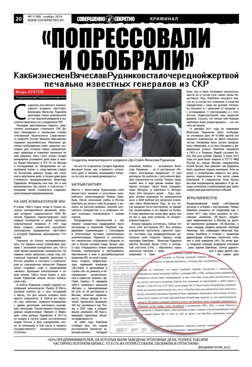 Наследие арестованных первого заместителя начальника столичного СКР Дениса Никандрова и начальника службы собственной безопасности Следственного комитета России Михаила Максименко поражает масштабностью. Несколько десятков возбуждённых либо закрытых уголовных дел, которые сейчас пересматривают ревизоры и отменяют принятые по ним решения. (Чего стоит только потеря материалов уголовного дела вора в законе Шакро Молодого в ГСУ СК по Москве и последующее их обнаружение на «запылённой полке» в следственном отделе по Таганскому району.) Среди них сложное и запутанное дело, а скорее даже дела столичного предпринимателя Вячеслава Рудникова. Интересны они тем, что в них реализовались все риски и опасности, с которыми может столкнуться современный успешный предприниматель.