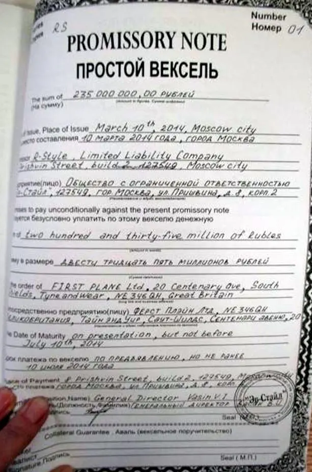 Вексель, выданный Васиным офшорной компании на 235 миллионов рублей