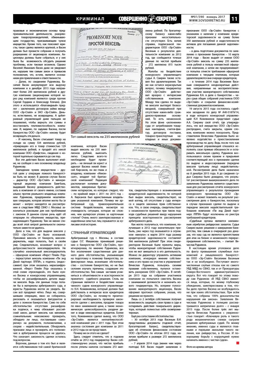 – Далее, по сведениям Рудникова, Василий Васин аккумулирует всю выручку компании и в декабре 2013 года направляет более 200 миллионов рублей в другую компанию (акционерами которой через ряд компаний являются среди прочих Сергей Гордеев и Александр Клячин). Для этого и используется «благовидный» предлог – заключение договоров займа между ООО «Эр-Стайл» и ЗАО «Эр-Стайл». Деньги, естественно, не возвращены. А арбитражный управляющий даже пальцем не пошевелил, чтобы вернуть эти суммы и восстановить платежеспособность компании. И, видимо, по задумке Васина, после банкротства ООО «Эр-Стайл» некому будет возвращать эти деньги.