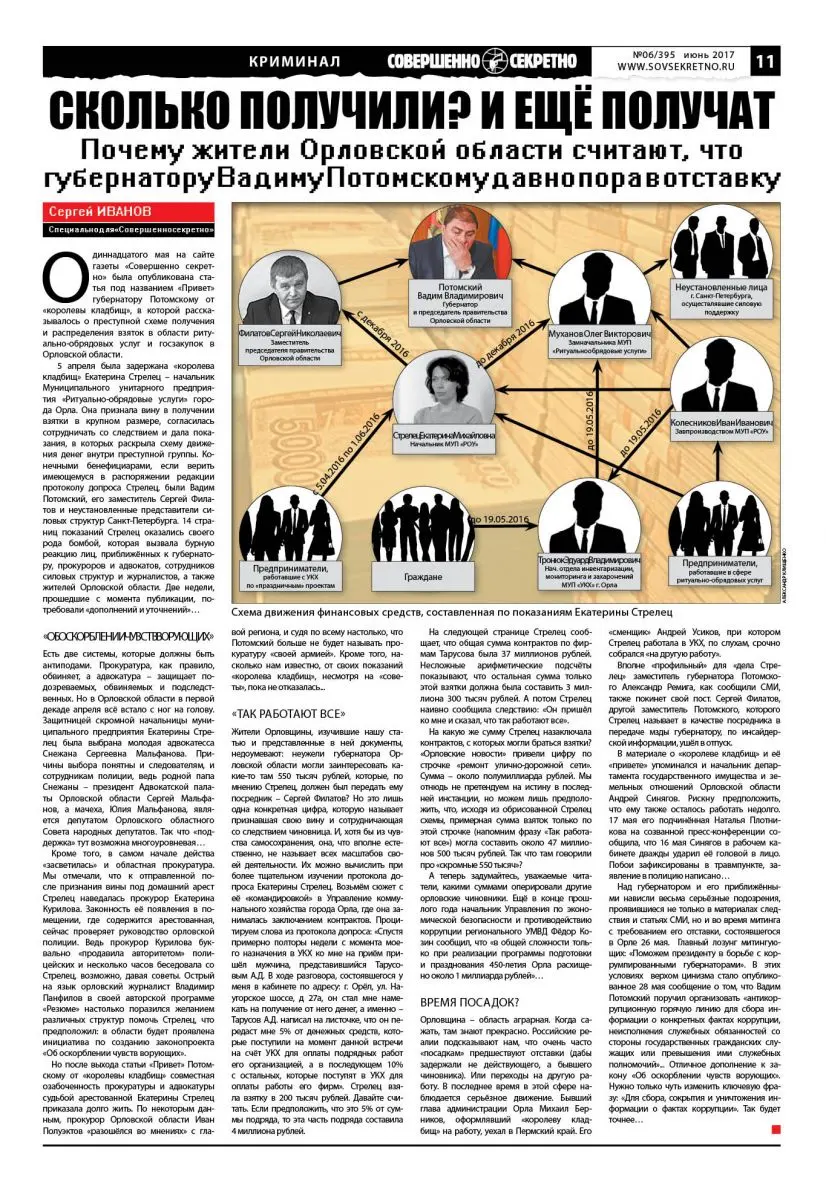 Одиннадцатого мая на сайте газеты «Совершенно секретно» была опубликована статья под названием «Привет» губернатору Потомскому от «королевы кладбищ», в которой рассказывалось о преступной схеме получения и распределения взяток в области ритуально-обрядовых услуг и госзакупок в Орловской области.
