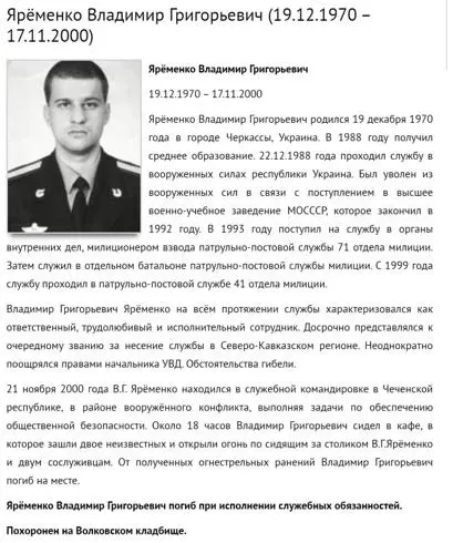 «21 ноября 2000 года В.Г. Ярёменко находился в служебной командировке в Чеченской республике, в районе вооружённого конфликта, выполняя задачи по обеспечению общественной безопасности. Около 18 часов Владимир Григорьевич сидел в кафе, в которое зашли двое неизвестных и открыли огонь по сидящим за столиком В.Г.Ярёменко и двум его сослуживцам. От полученных огнестрельных ранений Владимир Григорьевич погиб на месте».
