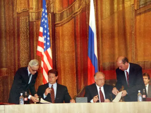 Договор, подписанный премьером России Виктором Черномырдиным и вице-президентом США Альбертом Гором в Вашингтоне в феврале 1993 года и больше известный как Соглашение ВОУ-НОУ (высокообогащённый уран – низкообогащённый уран), или «Мегатонны – в мегаватты», предусматривал извлечение из российских ядерных боеголовок оружейного урана и его переработку в топливо для американских атомных электростанций.