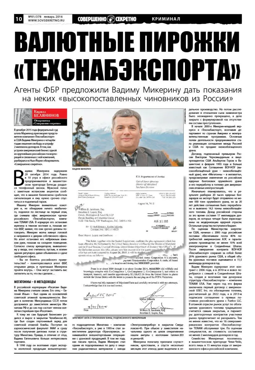 Сразу же после ареста своего представителя «Росатом» выступил с официальным заявлением, назвав действия ФБР «политически мотивированными». «Американская сторона пыталась склонить Микерина к сотрудничеству против России в обмен на свободу», сообщило российское ведомство. На своей невиновности в течение нескольких месяцев настаивал и сам Микерин. Именно поэтому официальное сообщение американского Минюста, появившееся на сайте министерства в самом конце лета, стало настоящей сенсацией. В коротком релизе сообщалось, что утром 31 августа 2015 года россиянин Вадим Микерин полностью признал себя виновным, согласившись со всеми обвинениями прокуратуры.