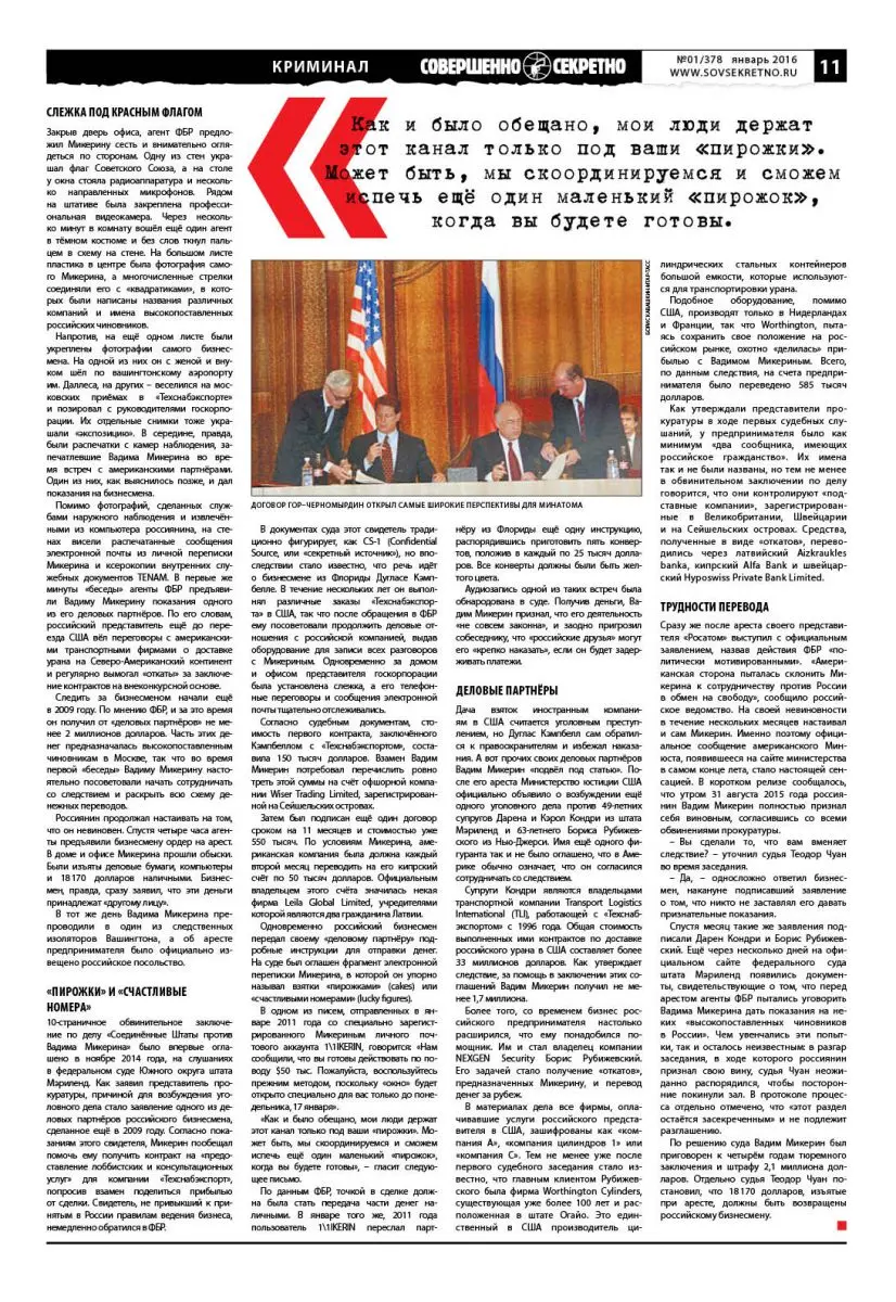 Напротив, на ещё одном листе были укреплены фотографии самого бизнесмена. На одной из них он с женой и внуком шёл по вашингтонскому аэропорту им. Даллеса, на других – веселился на московских приёмах в «Техснабэкспорте» и позировал с руководителями госкорпорации. Их отдельные снимки тоже украшали «экспозицию». В середине, правда, были распечатки с камер наблюдения, запечатлевшие Вадима Микерина во время встреч с американскими партнёрами. Один из них, как выяснилось позже, и дал показания на бизнесмена.