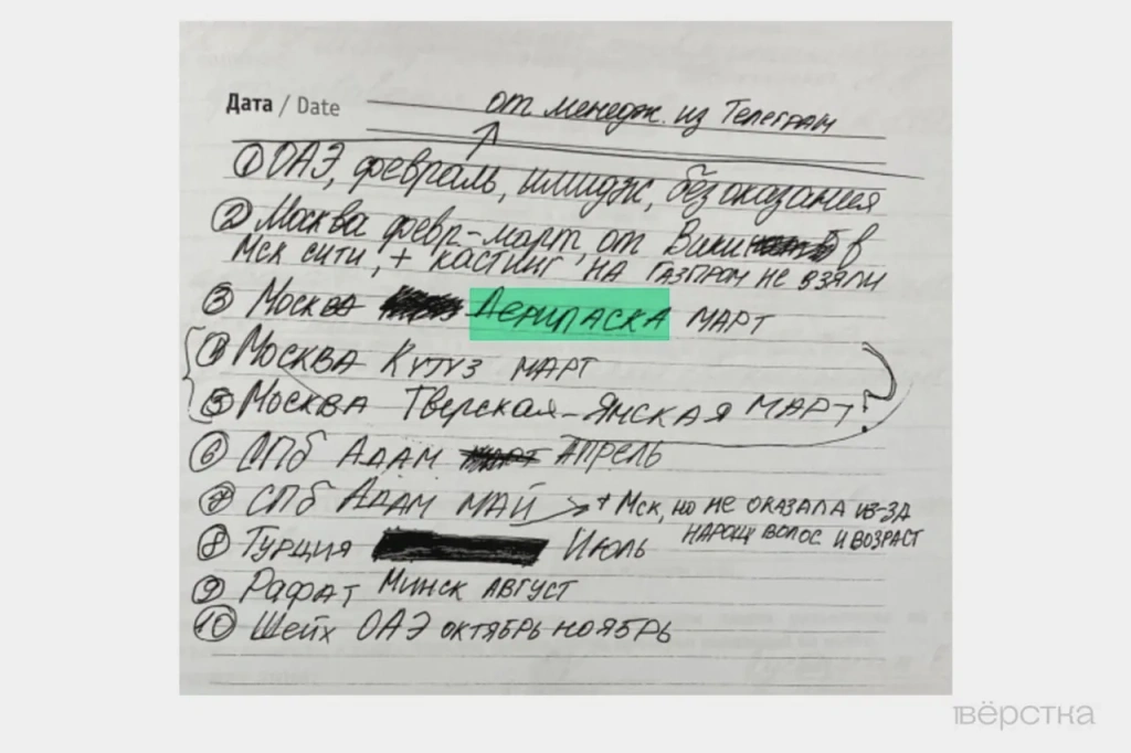 В числе клиентов этой сети авторами текста осторожно упоминался бизнесмен Олег Дерипаска. В «доказательство» его причастности было показано фото листка из блокнота сутенёров, на котором была написана его фамилия. Также было опубликовано видео допроса девушки с заблюренным лицом, которая, отвечая на вопрос офицера полиции, говорит о том, что, будучи несовершеннолетней, якобы имела интимные отношения с человеком, информацию о котором впоследствии нашла в Интернете – это был Дерипаска. Как сообщили авторы расследования, эти материалы взяты из 25-томного уголовного дела, которое «оказалось в их распоряжении» в результате «слива». Также сообщалось, что дело давно раскрыто, сутенёры осуждены, но на финальной стадии следствия и на суде фамилия Дерипаски не звучала.