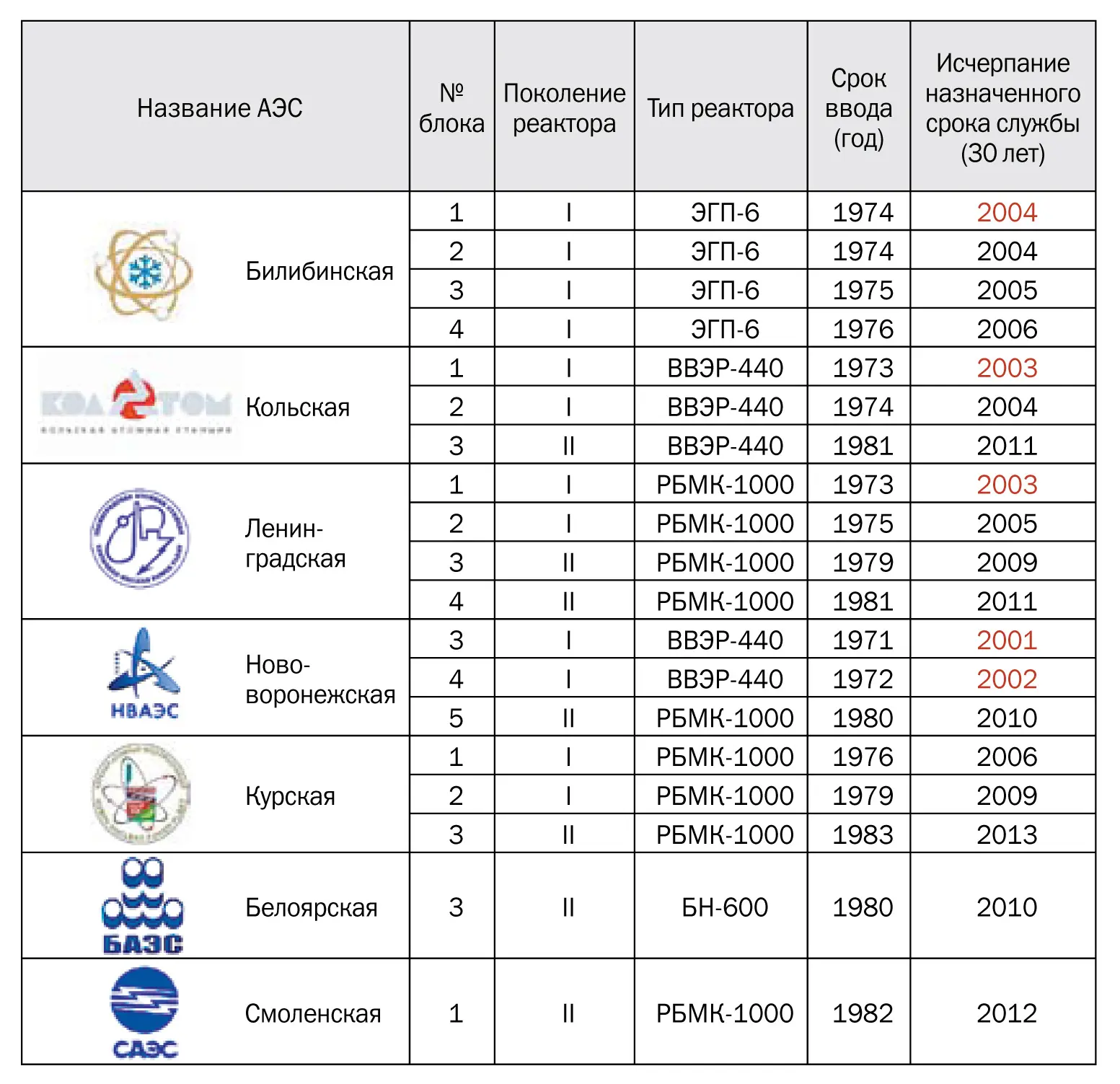 В России уже закончился проектный срок эксплуатации энергоблоков на Билибинской, Кольской, Ленинградской, Нововоронежской, Белоярской АЭС. Приближается исчерпание назначенного срока службы реакторов второго поколения на Курской и Смоленской АЭС (Таблица 1.). Выведена из эксплуатации только Обнинская АЭС, запущенная аж в 1954 году. Остановлено по два реактора на Нововоронежской и Белоярской атомных станциях – из них выгружено отработавшее ядерное топливо. Но работы, предполагающие фактический демонтаж оборудования, очистку территории, отложены на неопределенный срок из-за отсутствия общей концепции и финансовых ресурсов.