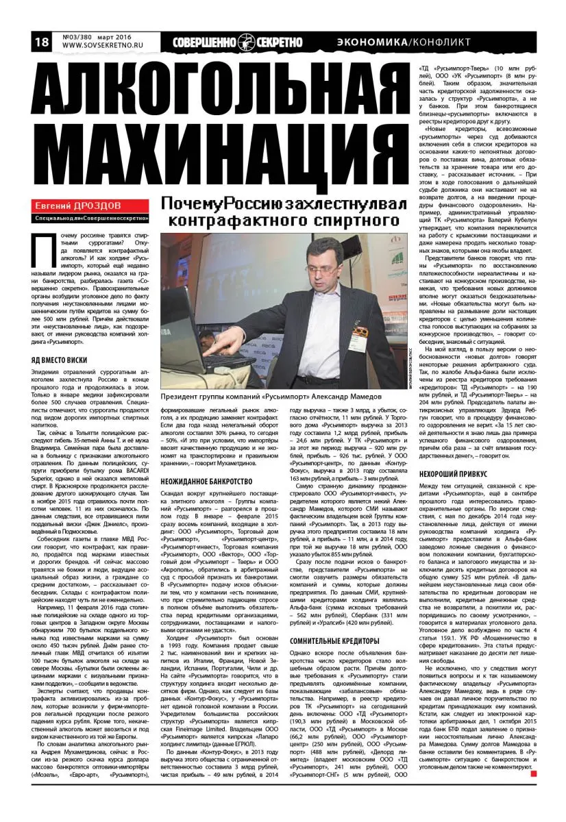 Почему россияне травятся спиртными суррогатами? Откуда появляется контрафактный алкоголь? И как холдинг «Русьимпорт», который ещё недавно называли лидером рынка, оказался на грани банкротства, разбиралась газета «Совершенно секретно». Правоохранительные органы возбудили уголовное дело по факту получения неустановленными лицами мошенническим путём кредитов на сумму более 500 млн рублей. Причём действовали эти «неустановленные лица», как подозревают, от имени руководства компаний холдинга «Русьимпорт».