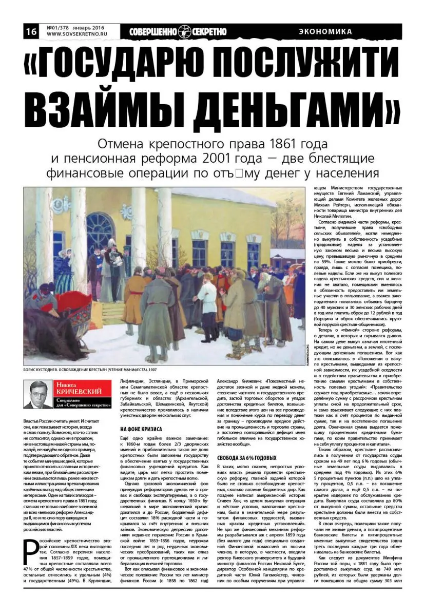 Отмена крепостного права 1861 года и пенсионная реформа 2001 года – две блестящие финансовые операции по отъёму денег у населения