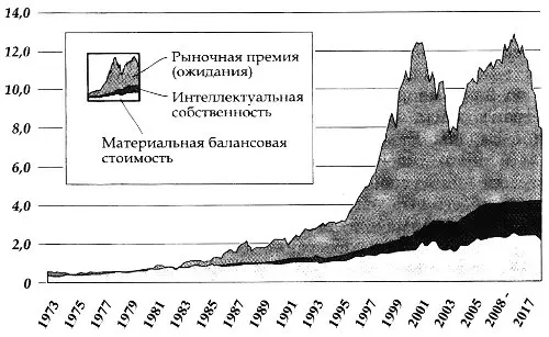 График №1. Материальная и рыночная стоимость пятисот крупнейших мировых компаний, контрорлируемых США