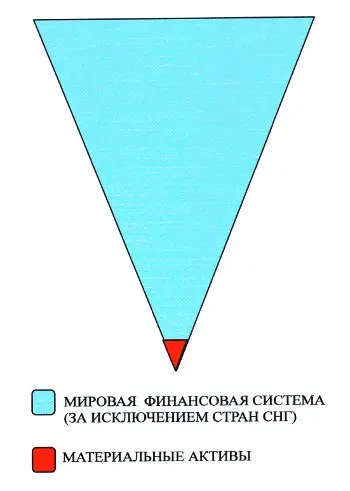 Вся наглядность – в приводимых нами графиках (см. график № 1). То, что внизу обозначено чёрным, – это реальная стоимость основных 500 крупнейших транснациональных и мировых компаний, контролируемых американцами. А верхняя линия – это их так называемая рыночная стоимость, то есть рыночная премия. Совершенно очевидно, что разрыв запредельный. Вторая, цветная таблица ещё более простая (см. график № 2). На ней обозначены финансовый пузырь и реальные активы. В принципе, профессионалам это, конечно, понятно. Но во избежание дикой паники не выносится в публичную сферу, не обсуждается и просто гасится.