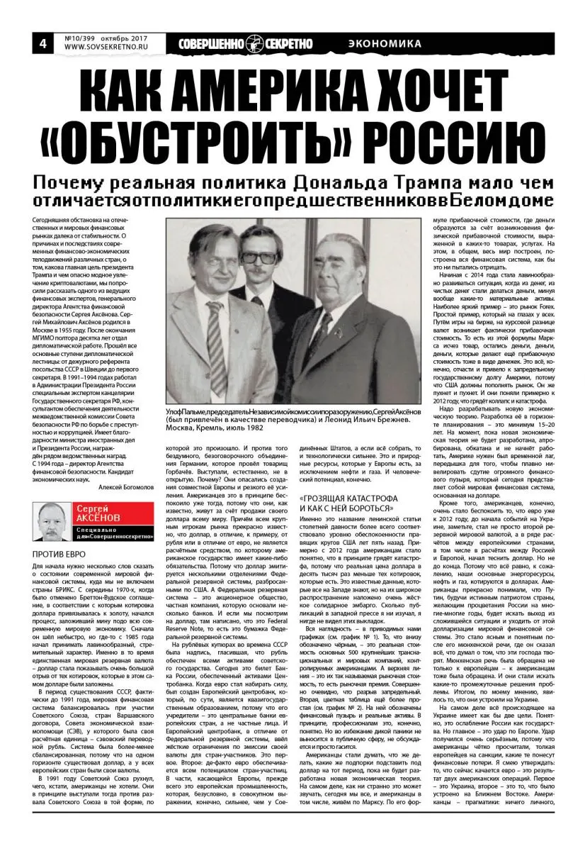 Как противостоять этим угрозам? В первую очередь необходимо проводить комплексные контрмеры, одной из которых может быть планомерное разоблачение реальных планов и побудительных мотивов действий США и связанной с Вашингтоном российской оппозиции. О других наших возможностях, санкциях и контрсанкциях, о том, кто и как способен бороться против реальной угрозы безопасности нашей страны и её суверенитету, мы с вами, уважаемые читатели, поговорим в следующем номере «Совершенно секретно».