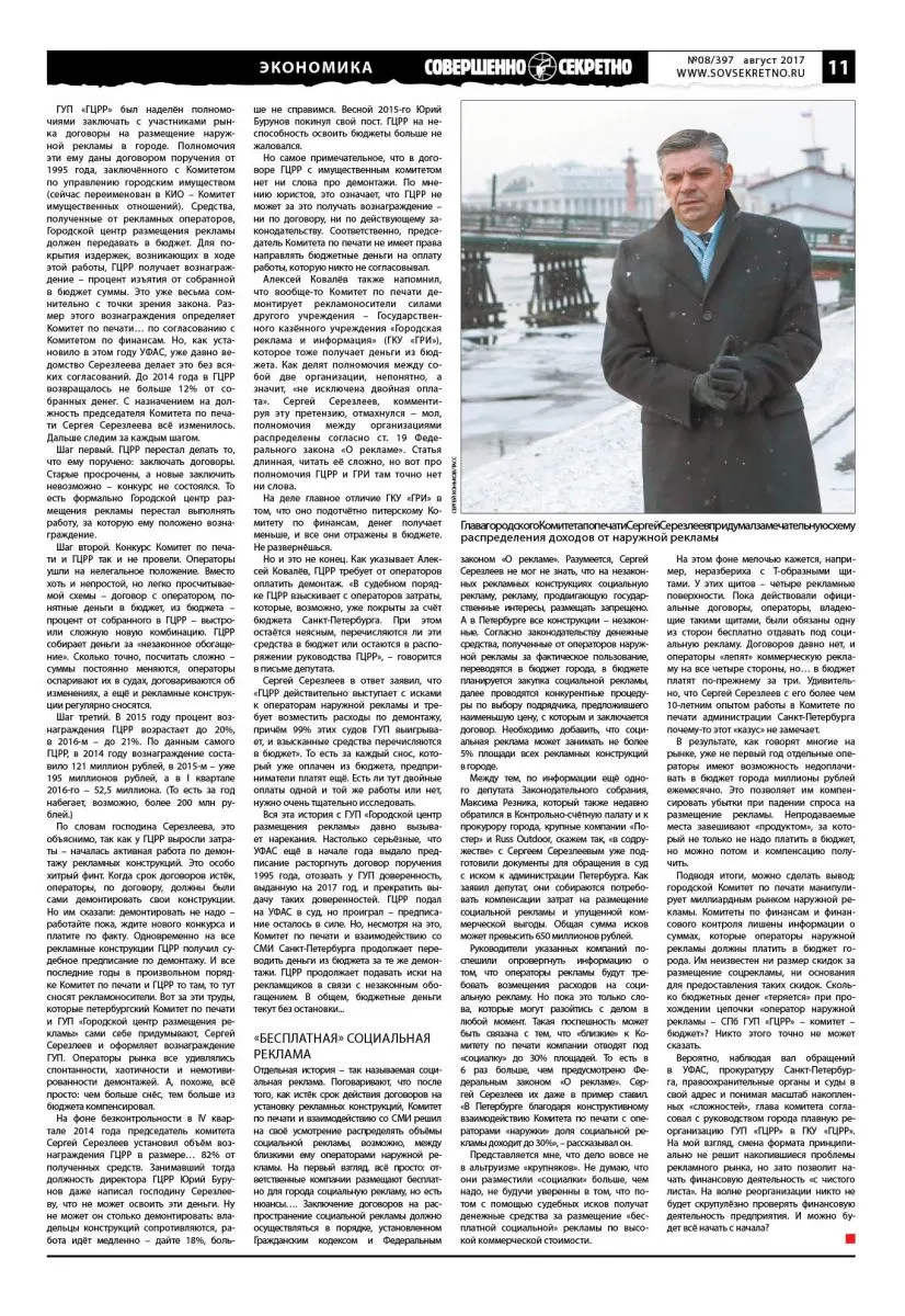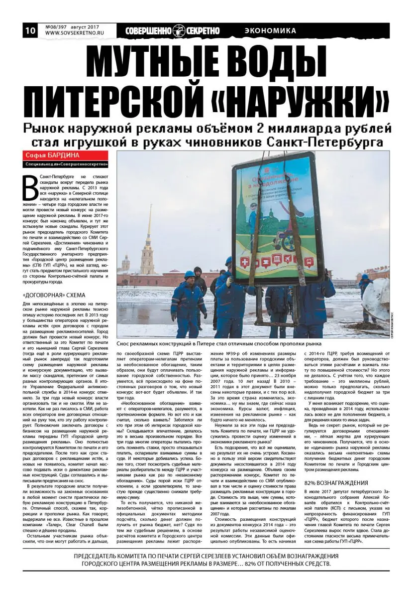 В Санкт-Петербурге не стихают скандалы вокруг передела рынка наружной рекламы. С 2013 года вся «наружка» в Cеверной столице находится на «нелегальном положении» – четыре года городские власти не могли провести новый конкурс на размещение наружной рекламы. В июне 2017-го конкурс был наконец объявлен, и тут же вспыхнули новые скандалы. Курирует этот рынок председатель городского Комитета по печати и взаимодействию со СМИ Сергей Серезлеев. «Достижения» чиновника и подчинённого ему Санкт-Петербургского Государственного унитарного предприятия «Городской центр размещения рекламы» (СПб ГУП «ГЦРР»), на мой взгляд, могут стать предметом пристального изучения со стороны Контрольно-счётной палаты и прокуратуры города.