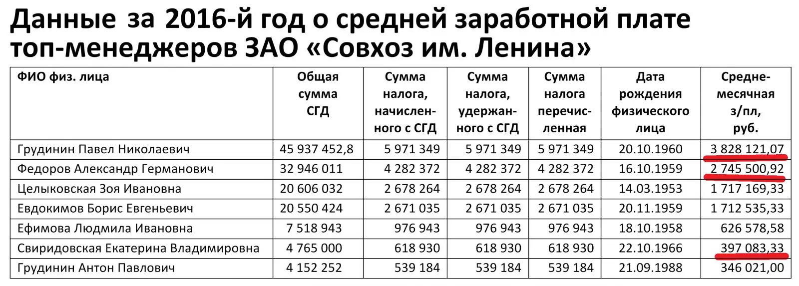Впрочем, не жалуются на жизнь и остальные топ-менеджеры Павла Грудинина. Посмотрите таблицу с их средними ежемесячными зарплатами за 2016 год в «социалистическом совхозе им. Ленина». Лично у Грудинина — 3 миллиона 828 тысяч рублей в месяц. У его зама Фёдорова - 2 миллиона 745 тысяч. У Екатерины Свиридовской - зарплата 397 тысяч (помните, она ещё параллельно является гендиректором убыточной фирмы «TT Девеломпент»). И, наконец, у сына директора совхоза Антона Грудинина – зарплата 346 тысяч рублей в месяц. Напомним, что по словам самого же кандидата в президенты, средняя зарплата у его сотрудников – 78 000 рублей.