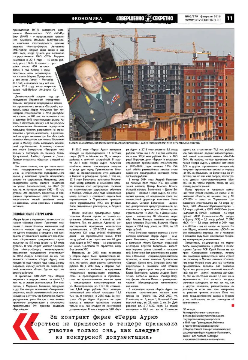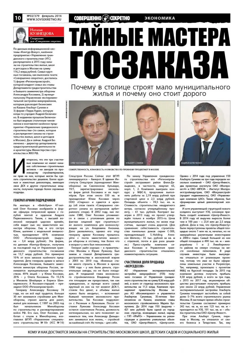 По данным информационной системы «Контур. Фокус» казенное предприятие «Управление гражданского строительства» (УГС) распределило в 2015 году заказы на строительство жилья, школ и детсадов в Москве на сумму 116,2 млрд рублей. Самые крупные госзаказы, как выяснила газета «Совершенно секретно», достались 1) фирме «Регионпромстрой», которой владеет семья экс–главы департамента градостроительства и бывшего замминистра обороны Александра Косована, 2) муниципальному «Управлению экспериментальной застройки микрорайнов», которым руководит продавец мерседесов из Казани Альберт Суниев и 3) фирме «Терра Аури», которой покровительствовал Андрей Белюченко. В недавнем прошлом Белюченко был видным столичным чиновником и возглавлял казённое предприятие «Управление гражданского строительства» (то самое, которое и распределяет заказы на строительство жилья, школ и детсадов в Москве). Да и сейчас Андрей Белюченко — директор Департамента градостроительной деятельности и архитектуры Министерства строительства РФ.