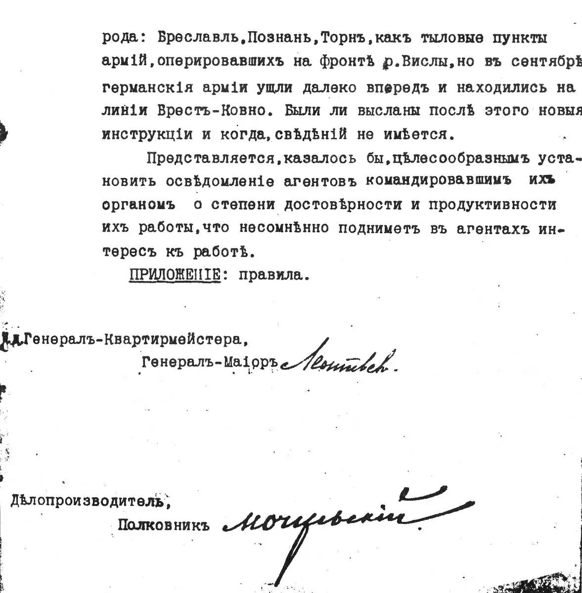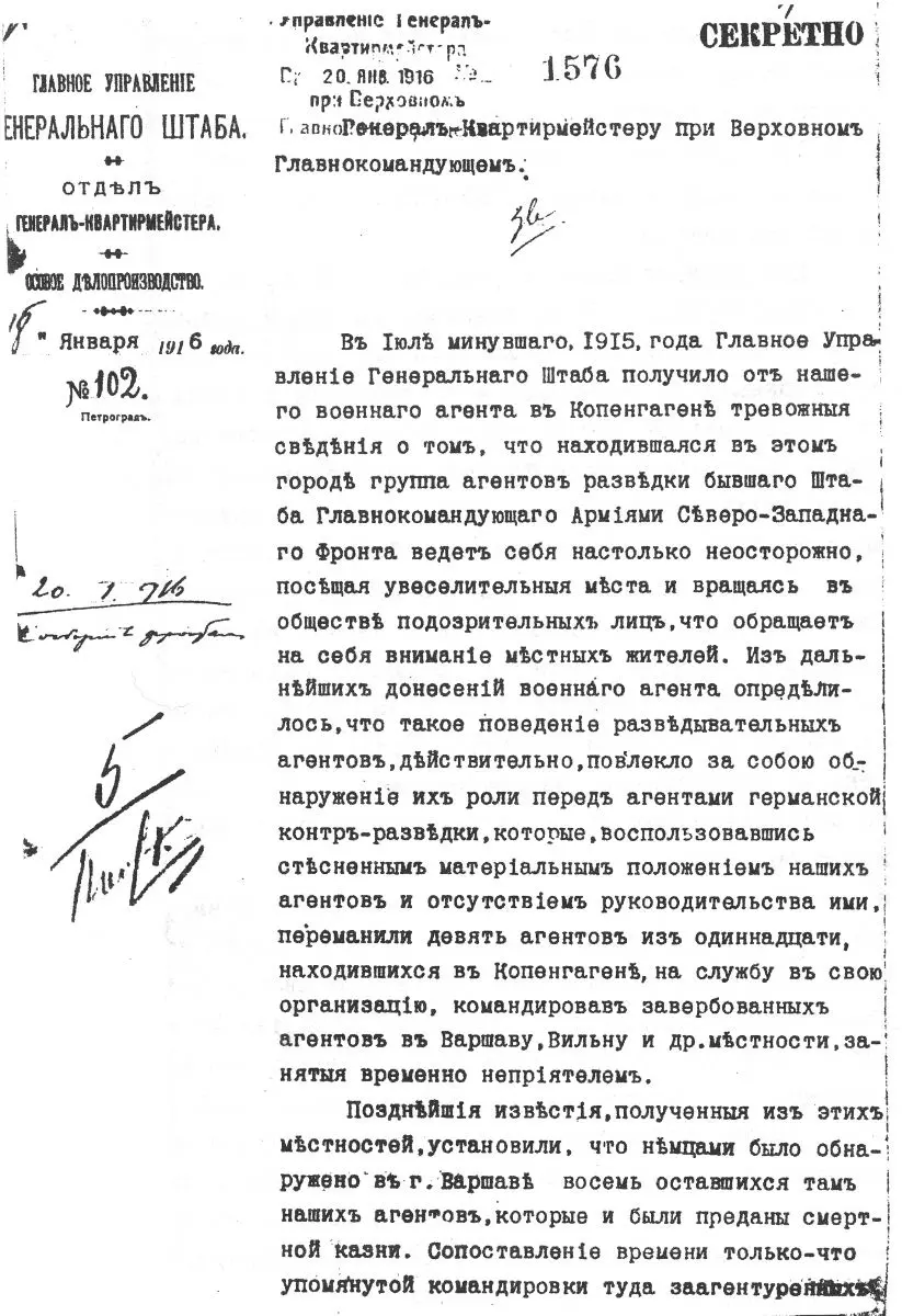 Он официально информировал коллегу, что в июле 1915 года от военного агента (то есть военного атташе) в Копенгагене были получены «тревожные сведения, что находившаяся в этом городе группа агентов разведки бывшего Штаба Главнокомандующего Армиями Северо-Западного фронта ведет себя настолько неосторожно, посещая увеселительные места и вращаясь в обществе подозрительных лиц, что обращает на себя внимание местных жителей».