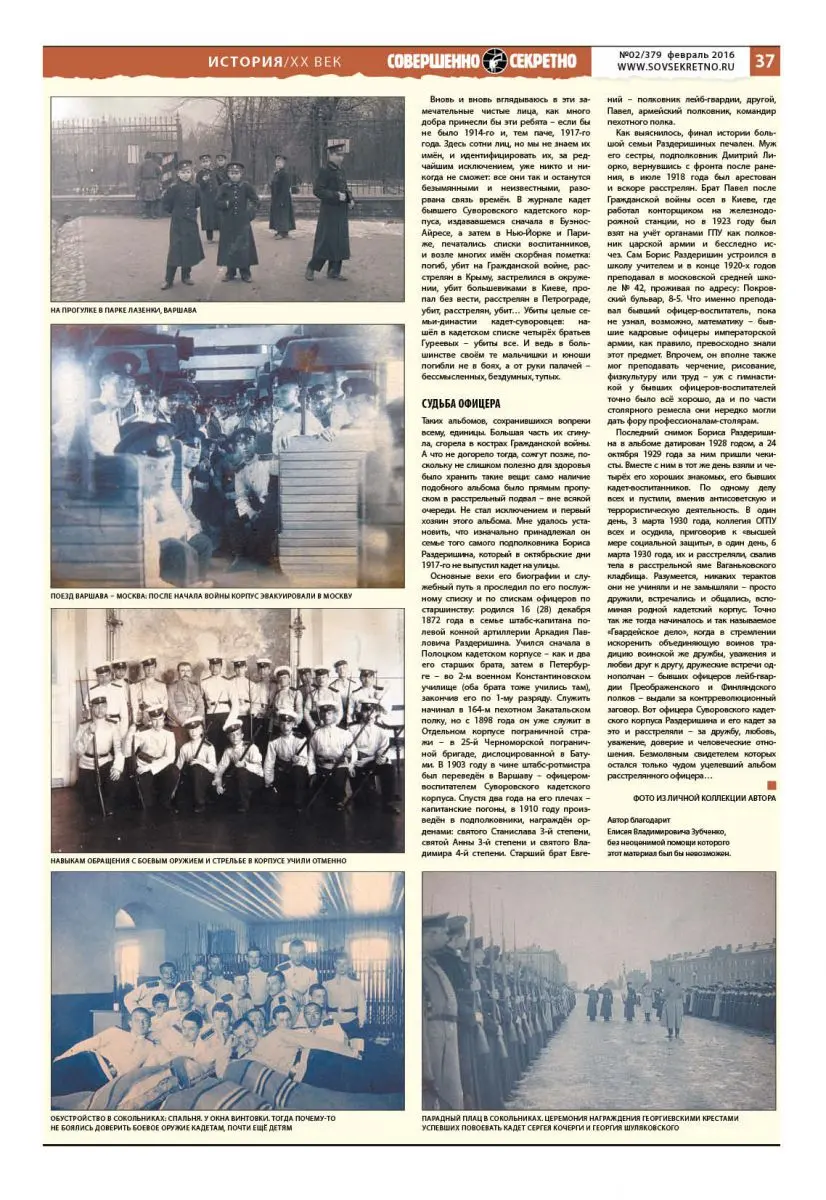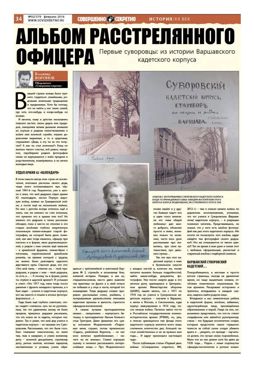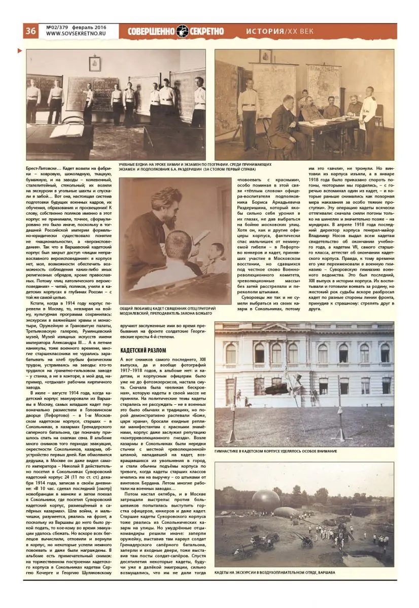После публикации статьи «Первый день войны» («Совершенно секретно», №6, 2012 г.) – там я описал начало войны по дедовским воспоминаниям, упомянув, что тот учился в Суворовском (Варшавском) кадетском корпусе, – в редакцию позвонил читатель. Представившись, он сказал, что у него есть альбом фотографий как раз этого кадетского корпуса. «Не хотите ли посмотреть этот альбом, вдруг найдёте там фотографии своего дедушки?» Кто же отказывается от такого шанса?! Так на время в мои руки и попал этот с любовью оформленный, увесистый и старинный альбом с подборкой снимков