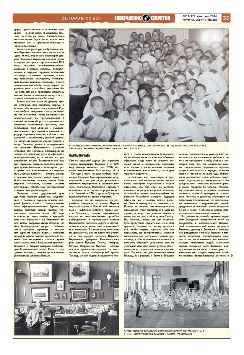 Вот далеко не полный перечень кадетских экскурсий, почерпнутый мной из документов и воспоминаний: Варшавский политехнический музей, дворец в Лазенках, дворец в Вилянове – загородная резиденция польских королей и магнатов, городская водопроводная станция – там им показывали, как выглядит система снабжения водой огромного города, пожарная часть Варшавы, воздухоплавательная часть и авиаотряд – с возможностью кому-то совершить полёт по жребию, форты Варшавы, крепость в Брест-Литовске… Кадет возили на фабрики – ковровую, шоколадную, ткацкую, бумажную, и на заводы – кожевенный, сталелитейный, стекольный; их возили на экскурсии в угольные шахты и спускали в забой… Вот она, настоящая система подготовки будущих военных кадров, их обучения, образования и просвещения! К слову, собственно поляков именно в этот корпус не принимали, точнее, сформулировано это было иначе, поскольку в тогдашней Российской империи формально-юридически существовало понятие не «национальности», а «вероисповедания». Так что в Варшавский кадетский корпус был закрыт доступ «лицам неправославного вероисповедания»: в корпусе нет, мол, возможности обеспечить возможность соблюдения каких-либо иных религиозных обрядов, кроме православных. Потому «лиц католического вероисповедания» – читай, поляков, учили в кадетских корпусах в глубинах России – с той же самой целью.