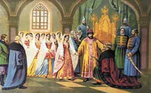 | «Выбор невесты царем Алексеем Михайловичем». Цветная литография. 1880-е годы | |
