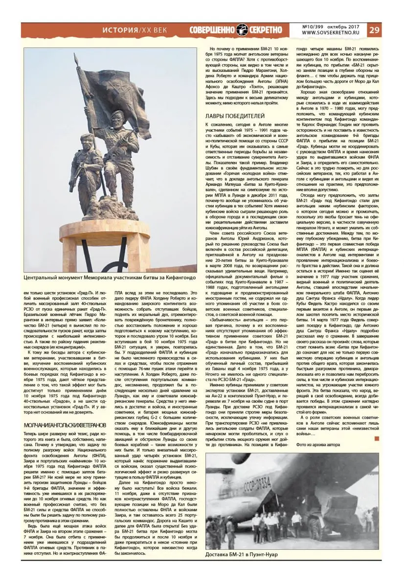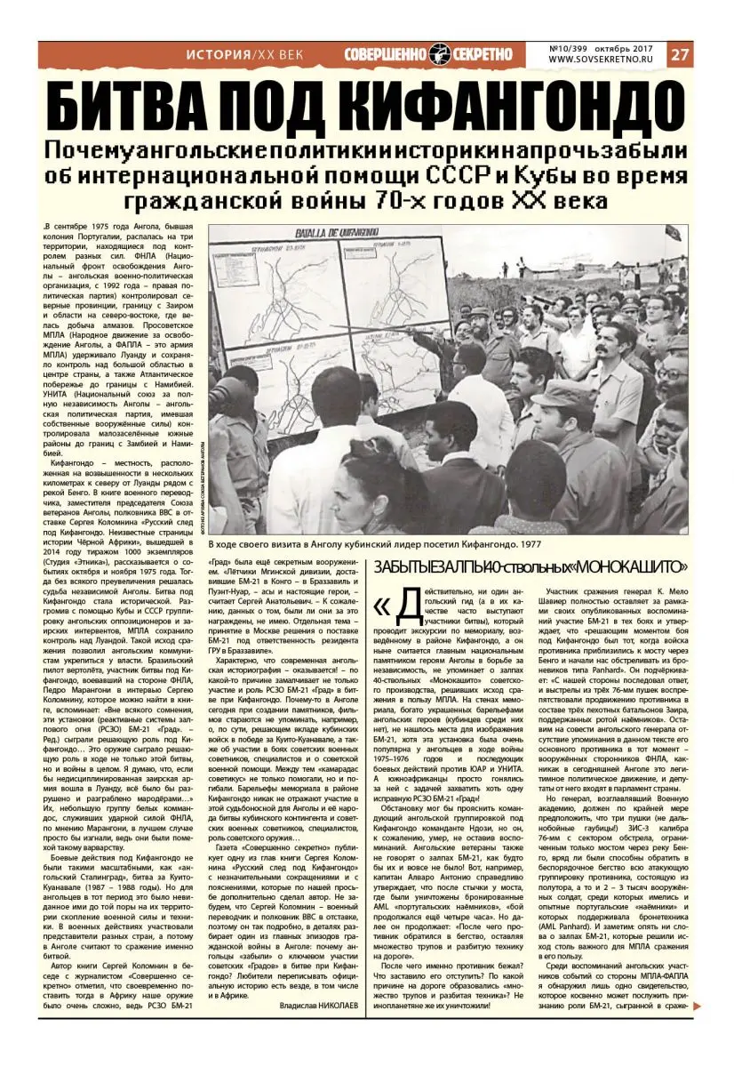 «Действительно, ни один ангольский гид (а в их качестве часто выступают участники битвы), который проводит экскурсии по мемориалу, возведённому в районе Кифангондо, а он ныне считается главным национальным памятником героям Анголы в борьбе за независимость, не упоминает о залпах 40-ствольных «Монокашито» советского производства, решивших исход сражения в пользу МПЛА. На стенах мемориала, богато украшенных барельефами ангольских героев (кубинцев среди них нет), не нашлось места для изображения БМ-21, хотя эта установка была очень популярна у ангольцев в ходе войны 1975–1976 годов и последующих боевых действий против ЮАР и УНИТА. А южноафриканцы просто гонялись за ней с задачей захватить хоть одну исправную РСЗО БМ-21 «Град»!