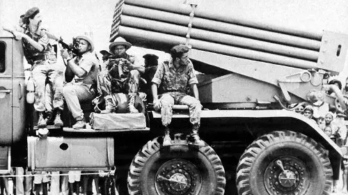 Ангольские военнослужащие ФАПЛА позируют на БМ-21 «Град» во время парада. В боевых действиях 1975 – 1976 годов в Анголе советские БМ-21 применялись исключительно кубинскими войсками, поскольку у ангольцев в тот период не было подготовленных кадров. 1976