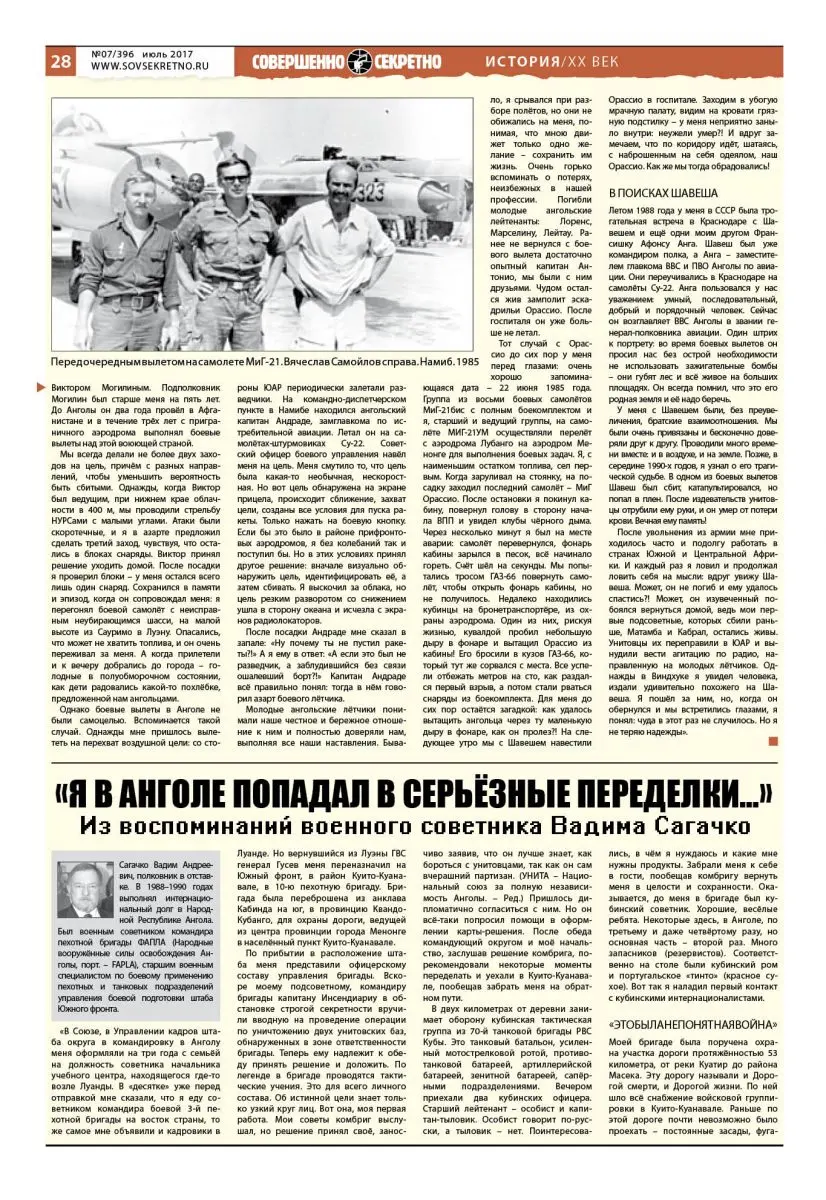 После увольнения из армии мне приходилось часто и подолгу работать в странах Южной и Центральной Африки. И каждый раз я ловил и продолжал ловить себя на мысли: вдруг увижу Шавеша. Может, он не погиб и ему удалось спастись?! Может, он изувеченный побоялся вернуться домой, ведь мои первые подсоветные, которых сбили раньше, Матамба и Кабрал, остались живы. Унитовцы их переправили в ЮАР и вынудили вести агитацию по радио, направленную на молодых лётчиков. Однажды в Виндхуке я увидел человека, издали удивительно похожего на Шавеша. Я пошёл за ним, но, когда он обернулся и мы встретились глазами, я понял: чуда в этот раз не случилось. Но я не теряю надежды».