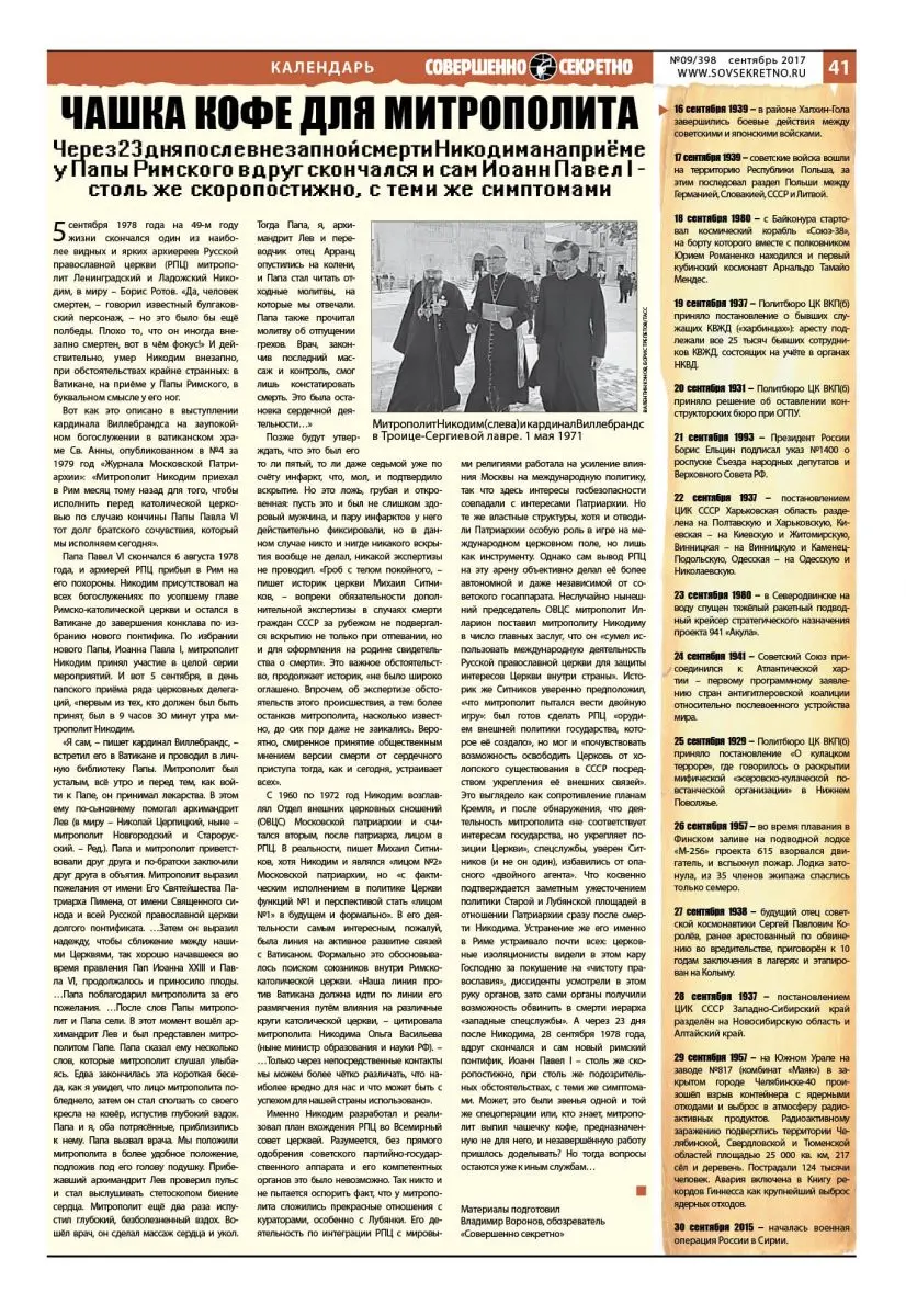 5 сентября 1978 года на 49-м году жизни скончался один из наиболее видных и ярких архиереев Русской православной церкви (РПЦ) митрополит Ленинградский и Ладожский Никодим, в миру – Борис Ротов. «Да, человек смертен, – говорил известный булгаковский персонаж, – но это было бы ещё полбеды. Плохо то, что он иногда внезапно смертен, вот в чём фокус!» И действительно, умер Никодим внезапно, при обстоятельствах крайне странных: в Ватикане, на приёме у Папы Римского, в буквальном смысле у его ног.