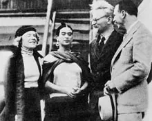 | Лев Троцкий (второй справа) с женой (крайняя слева) нашел убежище в доме Диего Риверы и Фриды Кало (рядом с Троцким) |
