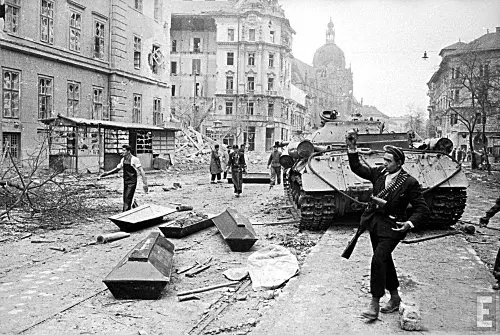 По расчёту наши войска подходят к Будапешту. Впереди у меня шёл тяжелый танк, за ним я в тяжёлом танке, затем два средних танка, а за ними до 15 грузовых автомашин с сотрудниками-венграми. Все были хорошо вооружены.