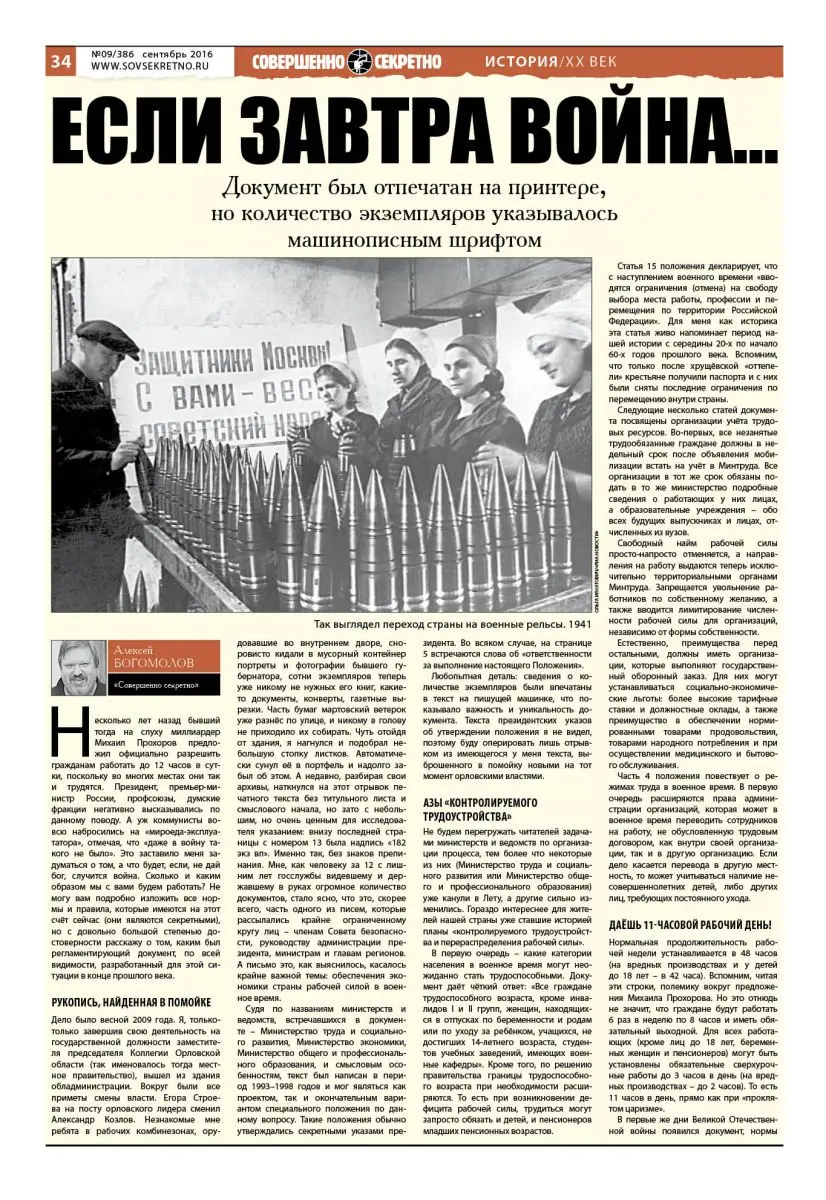Несколько лет назад бывший тогда на слуху миллиардер Михаил Прохоров предложил официально разрешить гражданам работать до 12 часов в сутки, поскольку во многих местах они так и трудятся. Президент, премьер-министр России, профсоюзы, думские фракции негативно высказывались по данному поводу. А уж коммунисты вовсю набросились на «мироеда-эксплуататора», отмечая, что «даже в войну такого не было». Это заставило меня задуматься о том, а что будет, если, не дай бог, случится война. Сколько и каким образом мы с вами будем работать? Не могу вам подробно изложить все нормы и правила, которые имеются на этот счёт сейчас (они являются секретными), но с довольно большой степенью достоверности расскажу о том, каким был регламентирующий документ, по всей видимости, разработанный для этой ситуации в конце прошлого века.