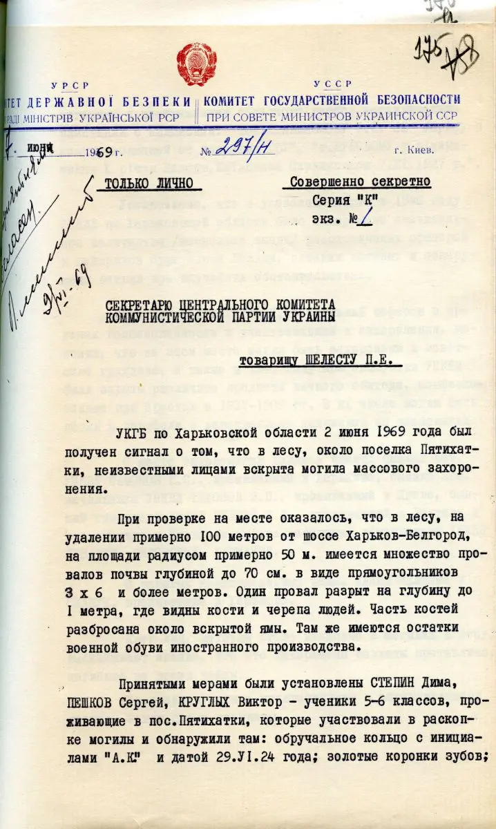 Причем докопаться – в самом прямом смысле слова, что по окончании учебного года и не замедлили сделать ученики 5-го и 6-го классов средней школы поселка Пятихатки (севернее Харькова) Дима Степин, Серёжа Пешков и Витя Круглых. Эти школьники-кладоискатели, – как гласит подписанная 7 июня 1969 года председателем КГБ при Совете Министров УССР генерал-полковником Виталием Никитченко совершенно секретная справка за № 297/н, направленная первому секретарю ЦК Компартии Украины Петру Шелесту и председателю КГБ СССР Юрию Андропову, – учинив самодеятельные раскопки какой-то таинственной ямы в лесу возле своего поселка, неожиданно обнаружили там целое массовое захоронение.