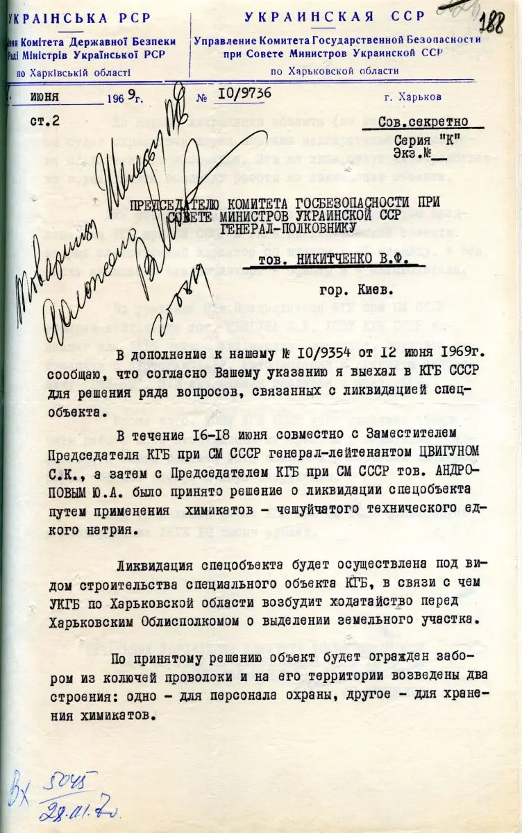 Разумеется, санкционировали, решив этот животрепещущий для КГБ вопрос без проволочек, срочно и оперативно. Для его решения и согласования проблем, «связанных с ликвидацией спецобъекта», в Москву откомандировали начальника УКГБ по Харьковской области генерал-майора Петра Фещенко. Который целых три дня, с 16 по 18 июня 1969 года, и консультировался на этот предмет непосредственно с председателем КГБ Юрием Андроповым и его замом, генералом Семеном Цвигуном.