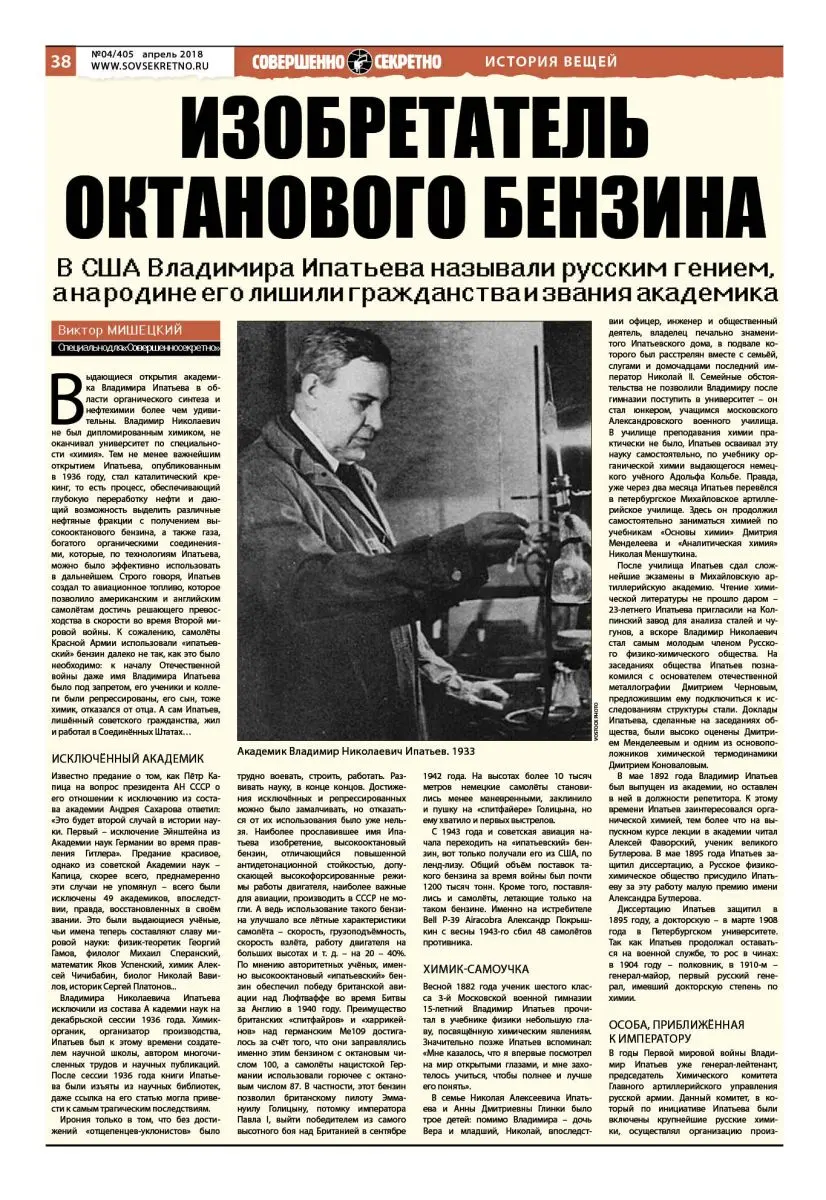 Выдающиеся открытия академика Владимира Ипатьева в области органического синтеза и нефтехимии более чем удивительны. Владимир Николаевич не был дипломированным химиком, не оканчивал университет по специальности «химия». Тем не менее важнейшим открытием Ипатьева, опубликованным в 1936 году, стал каталитический крекинг, то есть процесс, обеспечивающий глубокую переработку нефти и дающий возможность выделить различные нефтяные фракции с получением высокооктанового бензина, а также газа, богатого органическими соединениями, которые, по технологиям Ипатьева, можно было эффективно использовать в дальнейшем. Строго говоря, Ипатьев создал то авиационное топливо, которое позволило американским и английским самолётам достичь решающего превосходства в скорости во время Второй мировой войны. К сожалению, самолёты Красной Армии использовали «ипатьевский» бензин далеко не так, как это было необходимо: к началу Отечественной войны даже имя Владимира Ипатьева было под запретом, его ученики и коллеги были репрессированы, его сын, тоже химик, отказался от отца. А сам Ипатьев, лишённый советского гражданства, жил и работал в Соединённых Штатах…