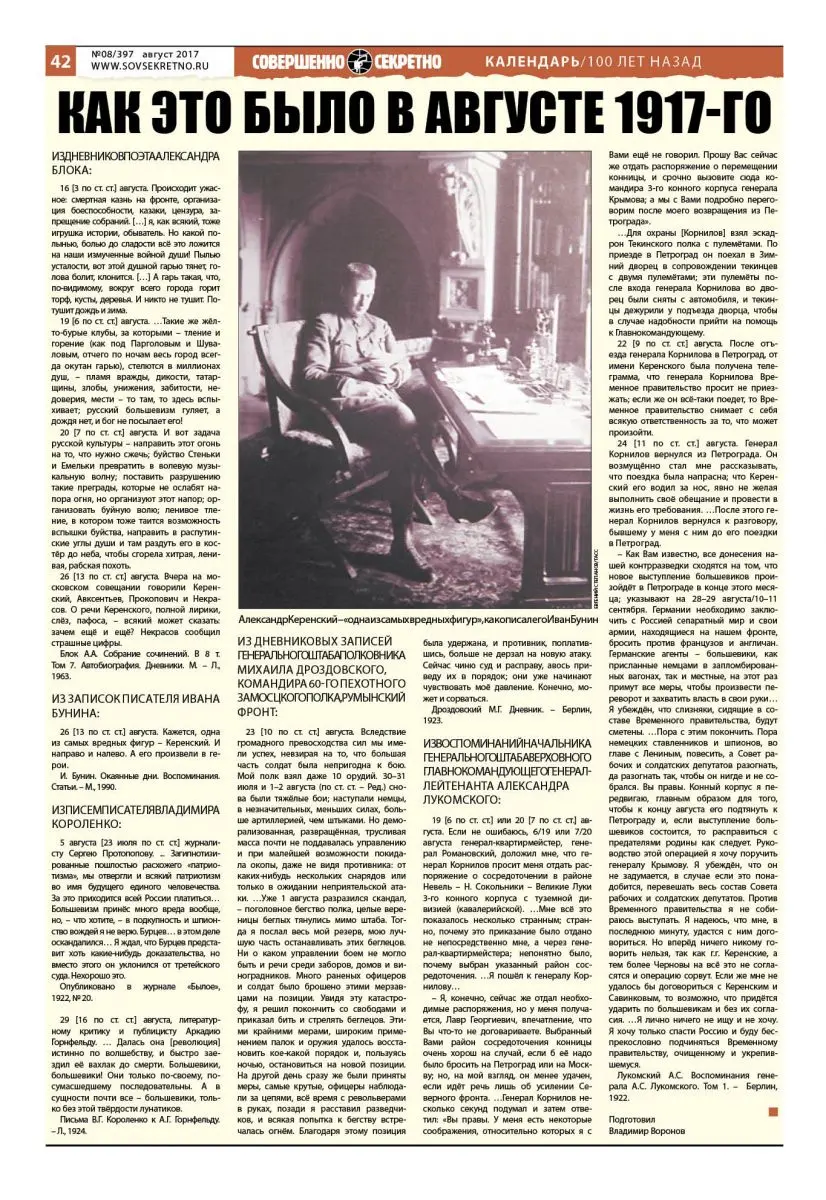 – Как Вам известно, все донесения нашей контрразведки сходятся на том, что новое выступление большевиков произойдёт в Петрограде в конце этого месяца; указывают на 28–29 августа/10–11 сентября. Германии необходимо заключить с Россией сепаратный мир и свои армии, находящиеся на нашем фронте, бросить против французов и англичан. Германские агенты – большевики, как присланные немцами в запломбированных вагонах, так и местные, на этот раз примут все меры, чтобы произвести переворот и захватить власть в свои руки… Я убеждён, что слизняки, сидящие в составе Временного правительства, будут сметены. …Пора с этим покончить. Пора немецких ставленников и шпионов, во главе с Лениным, повесить, а Совет рабочих и солдатских депутатов разогнать, да разогнать так, чтобы он нигде и не собрался. Вы правы. Конный корпус я передвигаю, главным образом для того, чтобы к концу августа его подтянуть к Петрограду и, если выступление большевиков состоится, то расправиться с предателями родины как следует. Руководство этой операцией я хочу поручить генералу Крымову. Я убеждён, что он не задумается, в случае если это понадобится, перевешать весь состав Совета рабочих и солдатских депутатов. Против Временного правительства я не собираюсь выступать. Я надеюсь, что мне, в последнюю минуту, удастся с ним договориться. Но вперёд ничего никому говорить нельзя, так как г.г. Керенские, а тем более Черновы на всё это не согласятся и операцию сорвут. Если же мне не удалось бы договориться с Керенским и Савинковым, то возможно, что придётся ударить по большевикам и без их согласия. …Я лично ничего не ищу и не хочу. Я хочу только спасти Россию и буду беспрекословно подчиняться Временному правительству, очищенному и укрепившемуся.