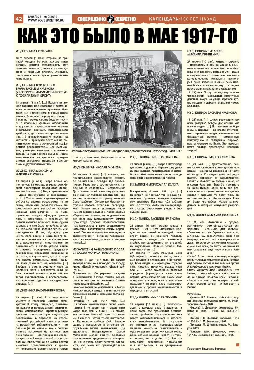 19 апреля [2 мая]. Вчера войне исполнилось 33 месяца, и вчера российский пролетариат праздновал повсеместно 1-е мая. […] Везде тучи народа – демонстрирующего и созерцающего. […] Участвовали в демонстрации и войска со своими оркестрами, но не скажу, чтобы они радовали своим видом. Как-то шли нестройно, подчёркивающе демократично – не было строевого порядка, офицеры тушевались и, смешиваясь с солдатами, не давали нужного военного тона, одним словом, это уже было не войско, а толпа. Впрочем, такое явление теперь уже повседневно. И мы, «буржуи», уже как-то мало верим в мощь такого воинства – воинства, не по форме одетого, расстёгнутого, неподтянутого, не признающего в своём укладе чинов и старших, всекурящего, бредущего гражданской косолапой походкой и готового, в случае чего, «дать в морду» своему начальнику, якобы раньше тоже дававшего им, солдатам. […] Вообще, в этих в сущности скучных шествиях (хотя и величественных) не было никакой поэзии и даже той, которая чувствовалась в послепасхальных крестных ходах и в народных хороводах. […]