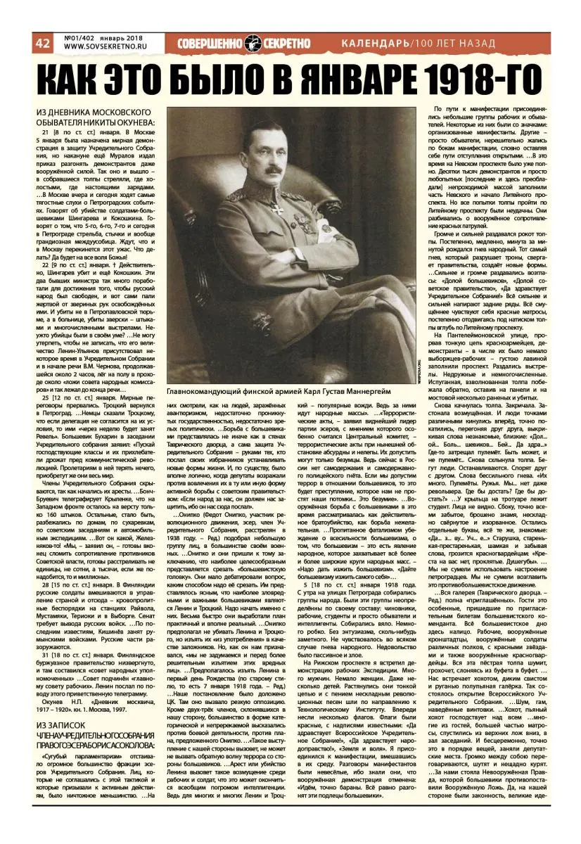 «Несмотря на то что советское правительство формально признало нашу независимость, оно, конечно же, не прислушалось к просьбе парламента о выводе русских частей из Финляндии. Их пребывание на финской территории имело вполне определённую цель: присоединить в дальнейшем наше государство к России. Таким образом, своеволие и беззаконие получили опору в виде русских частей, которыми руководил совет солдатских депутатов, располагавшийся в Выборге. У законного правительства Финляндии пока ещё не было достаточно сил, чтобы сдержать растущую анархию и пресечь подготовку восстания. …16 января я посетил Свинхувуда (председатель сената Финляндии. – Ред.).