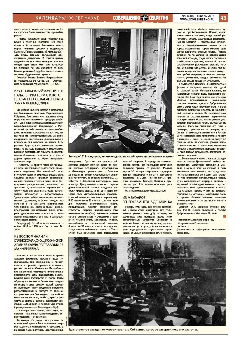 28 [15 по ст. ст.] января. В Финляндии русские солдаты вмешиваются в управление страной и отсюда – кровопролитные беспорядки на станциях Райвола, Мустамяки, Териоки и в Выборге. Сенат требует вывода русских войск. …По последним известиям, Кишинёв занят румынскими войсками. Русские части разоружаются.