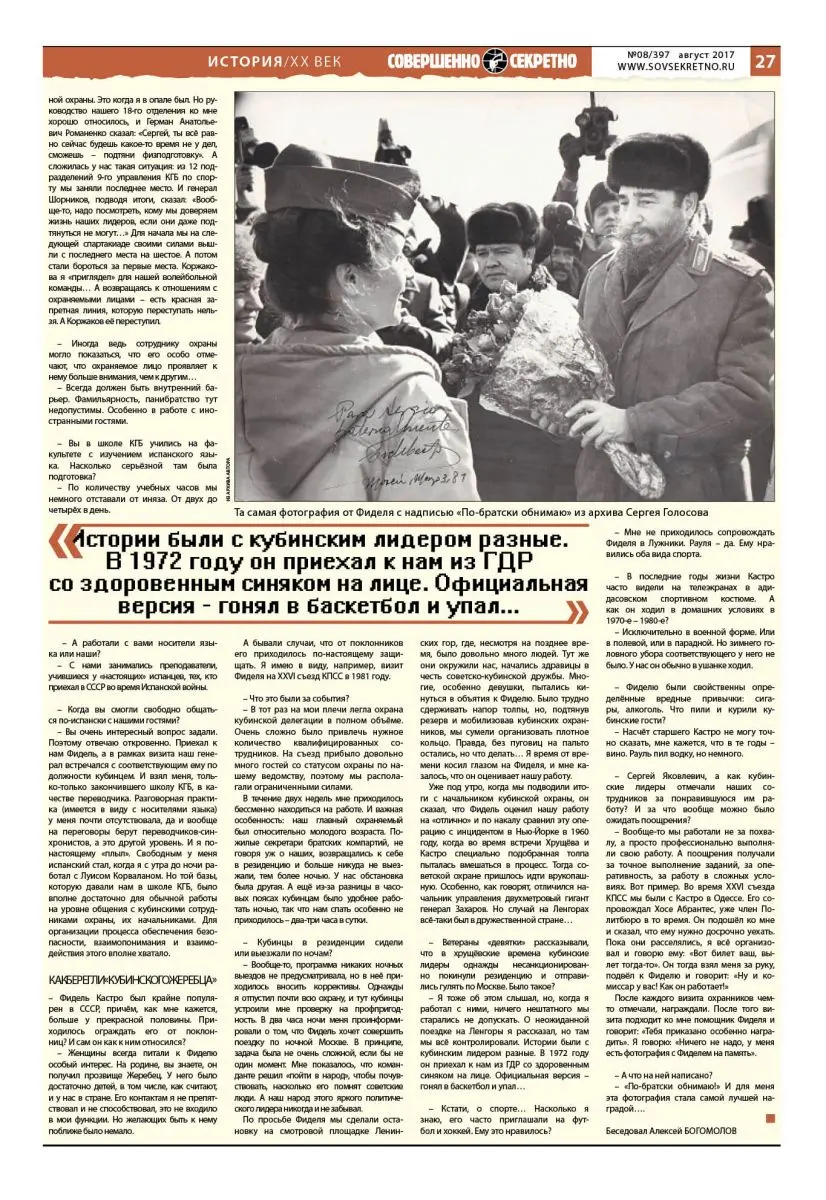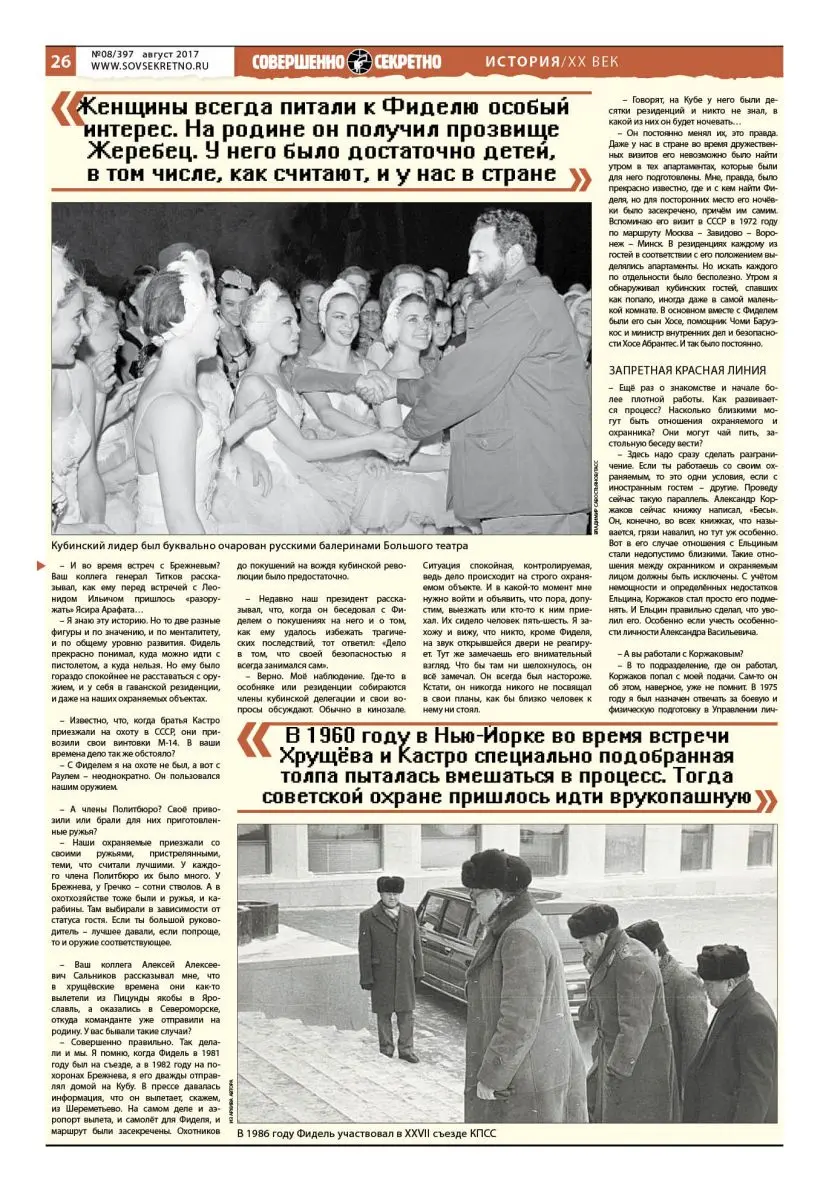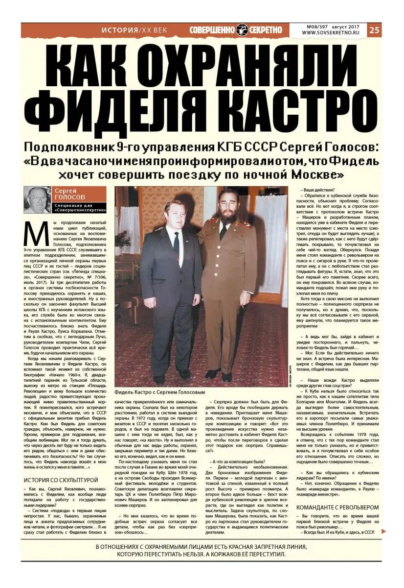 Мы продолжаем начатый нами цикл публикаций, основанных на воспоминаниях Сергея Яковлевича Голосова, подполковника 9-го управления КГБ СССР, служившего в элитном подразделении, занимавшемся организацией личной охраны первых лиц СССР и их гостей – лидеров социалистических стран (см. «Легенда спецназа», «Совершенно секретно», № 7/396, июль 2017). За три десятилетия работы в органах системы госбезопасности Голосову приходилось охранять и наших, и иностранных руководителей. Ну а поскольку он закончил факультет Высшей школы КГБ с изучением испанского языка, его служба была во многом связана с испаноязычным контингентом. Ему посчастливилось близко знать Фиделя и Рауля Кастро, Луиса Корвалана. Отметим в скобках, что с легендарным Лучо, руководителем компартии Чили, Сергей Голосов проводил практически всё время, будучи начальником его охраны.